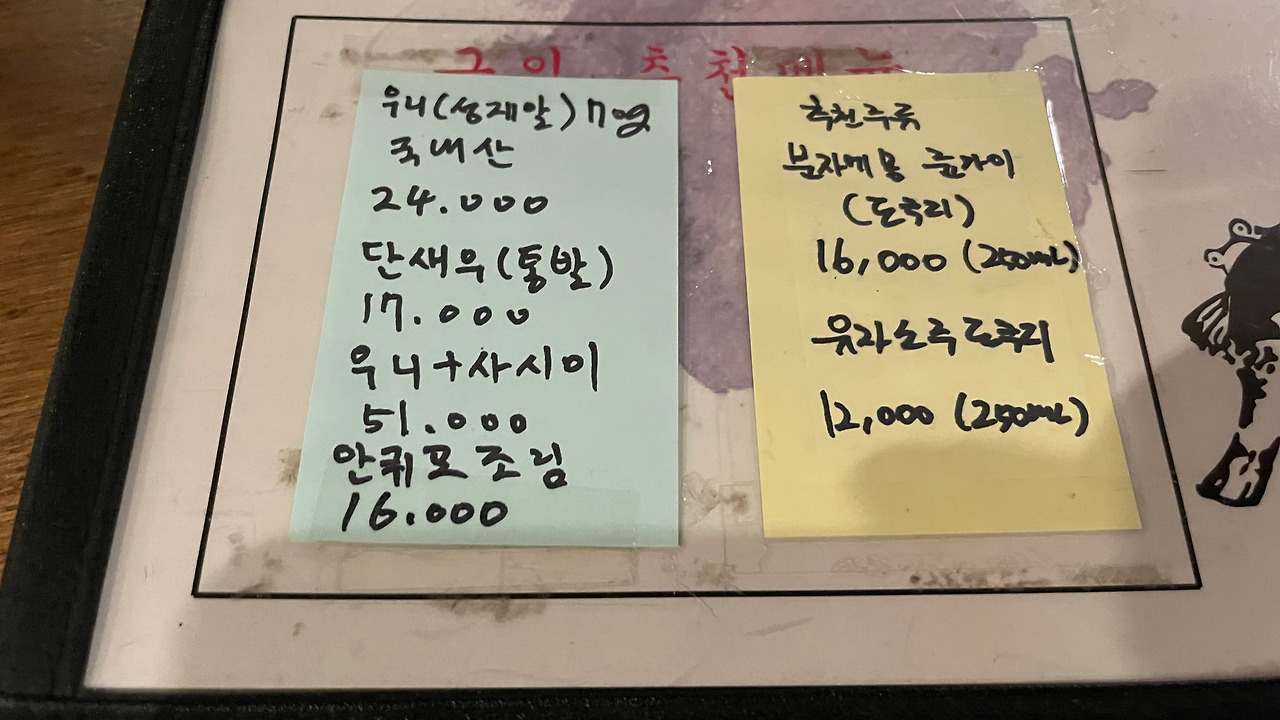메뉴판 맨 앞에는 추천 메뉴와 술이 포스트잇에 쓰여 있다.