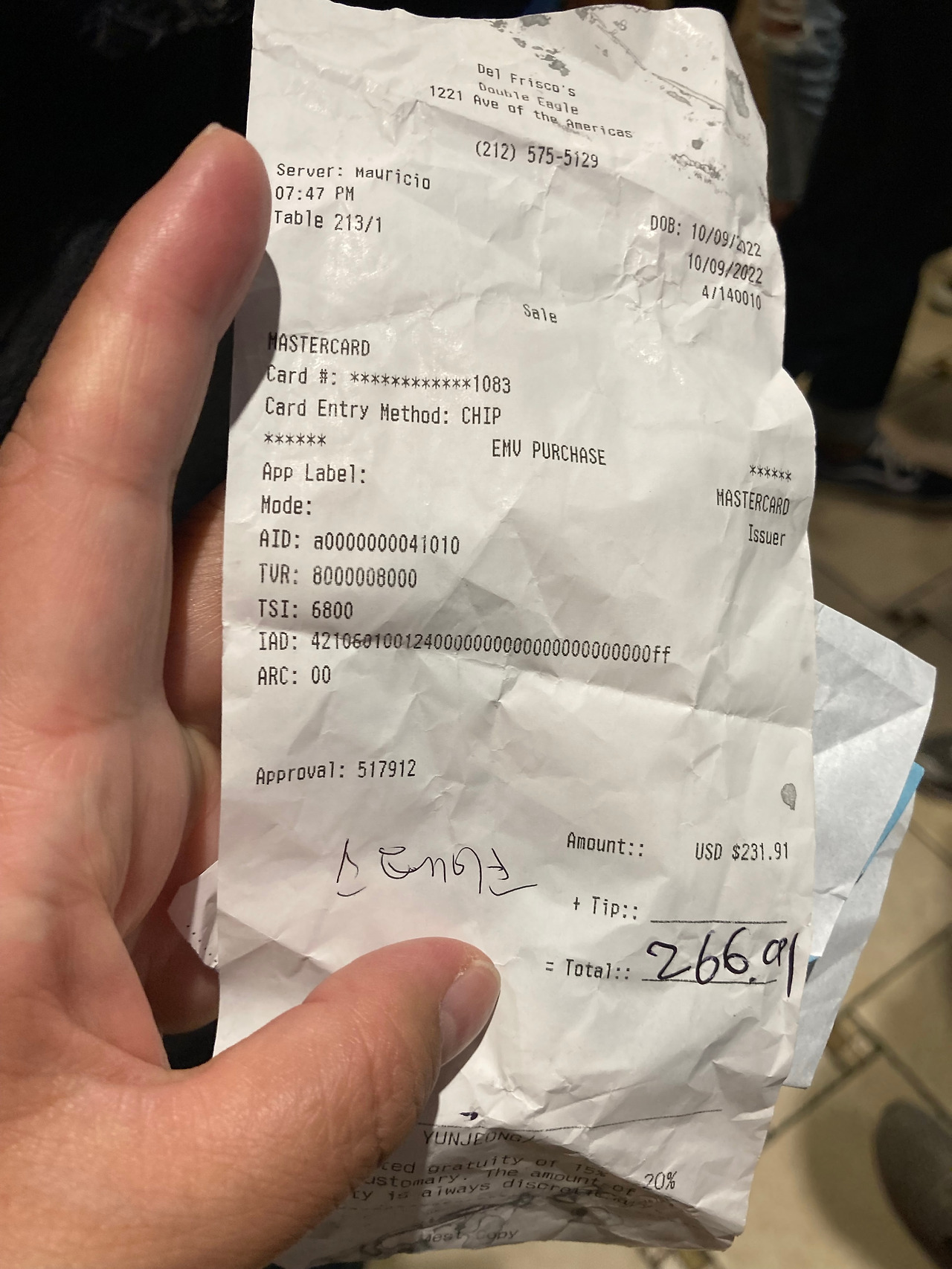 바에 앉아서 옆 테이블을 보니까 옆 손님이 식사를 마치고 웨이터에게 계산서를 달라고 하자, 웨이터는 계산서를 주고 나서 다른 일을 보더라고. 옆 손님이 1달러를 바 테이블에 얹어 두고, 계산은 카운터에서 하고 나갔는데, 웨이터는 한참 있다가 테이블을 치우면서 팁을 가져가더라고. 그래서 우리는 그냥 카운터에서 계산만 했지. 팁은 안 주고.