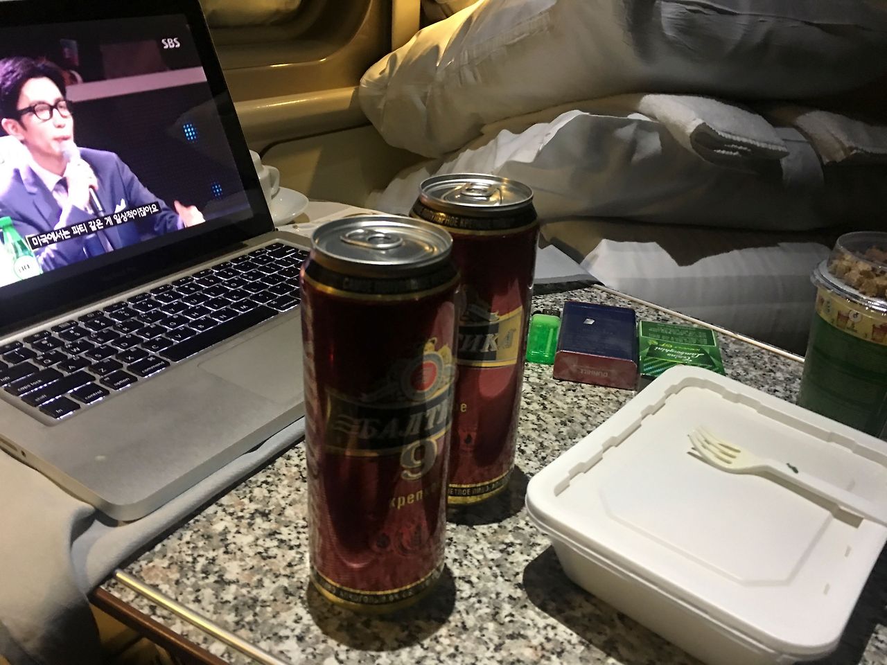 열차 안에서 음주는 금지되어 있지만 1등 칸이라 프라이빗한 공간을 보장받을 수 있었기에 주섬주섬 맥주를 꺼내 미리 다운로드하여 둔 한국 프로그램을 보며 홀짝였다.