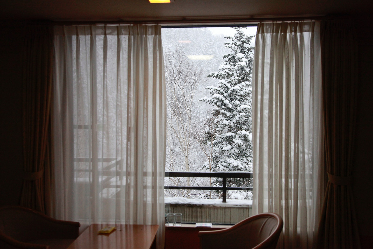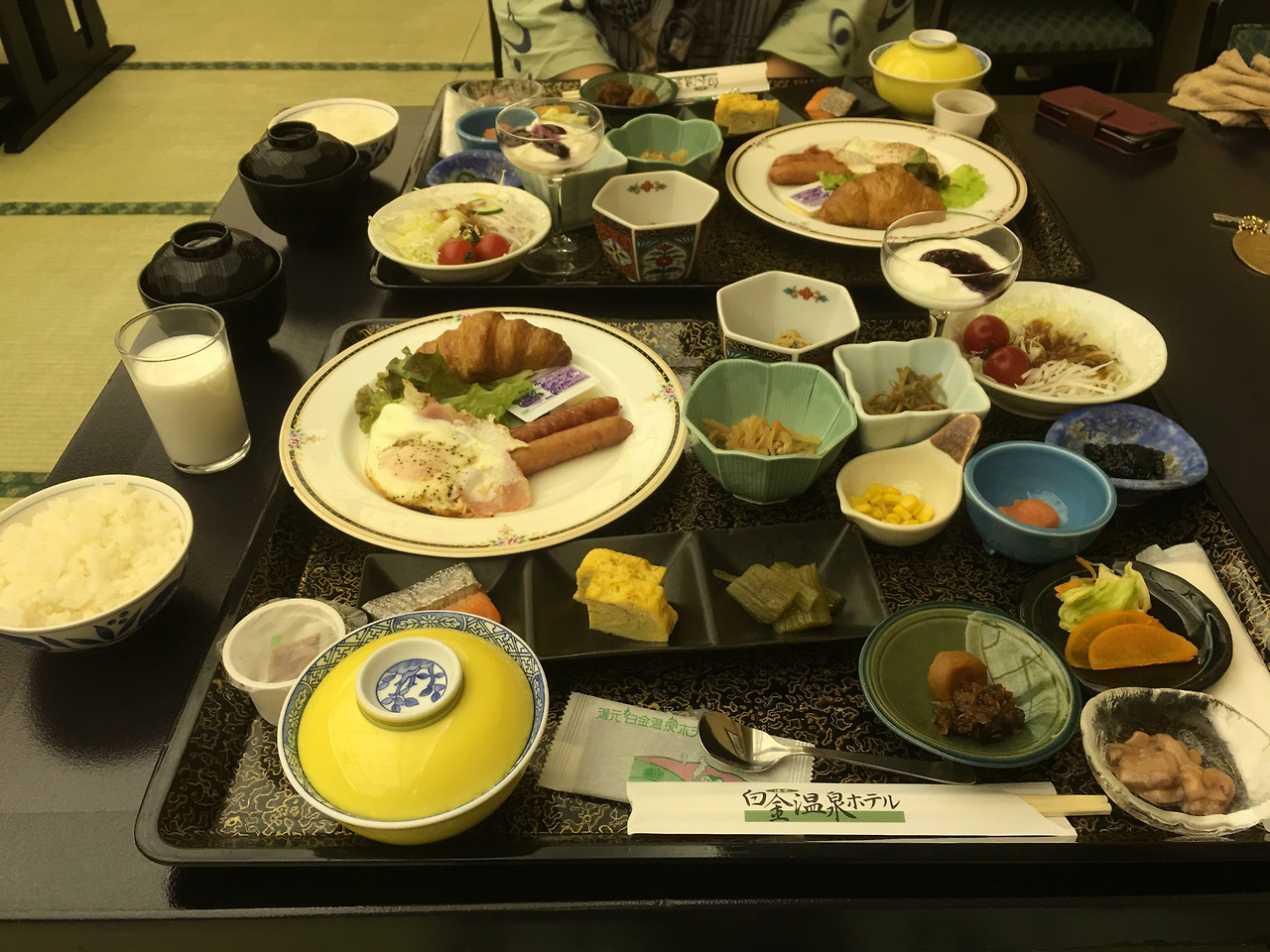 아침에 일어나 창밖을 보니 딱 크리스마스트리 비주얼의 전나무가 보인다. 온천 후 조식을 먹으러 내려가니 일본식과 양식을 조합한 한상이 떡하니 차려져 있다. 조식에 감동받아서 이듬해 여름에도 이 호텔을 찾았는데 여름에는 숙박객이 많아서인지 뷔페식으로 바뀌어 있어서 아쉬웠다.