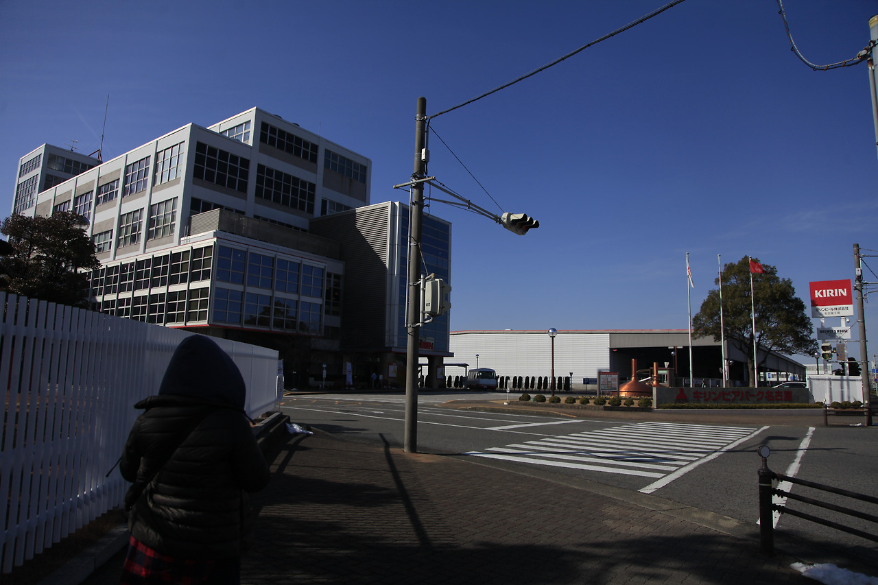 다음날 드디어 고대하던 기린 맥주공장을 향해 길을 나섰다. 여학생들의 뒷모습이 여기가 일본임을 다시 한 번 실감케한다. 멀리서 기린 공장이 모습을 드러낸다. 기린 간판만 봤는데도 표정이 밝아졌다.