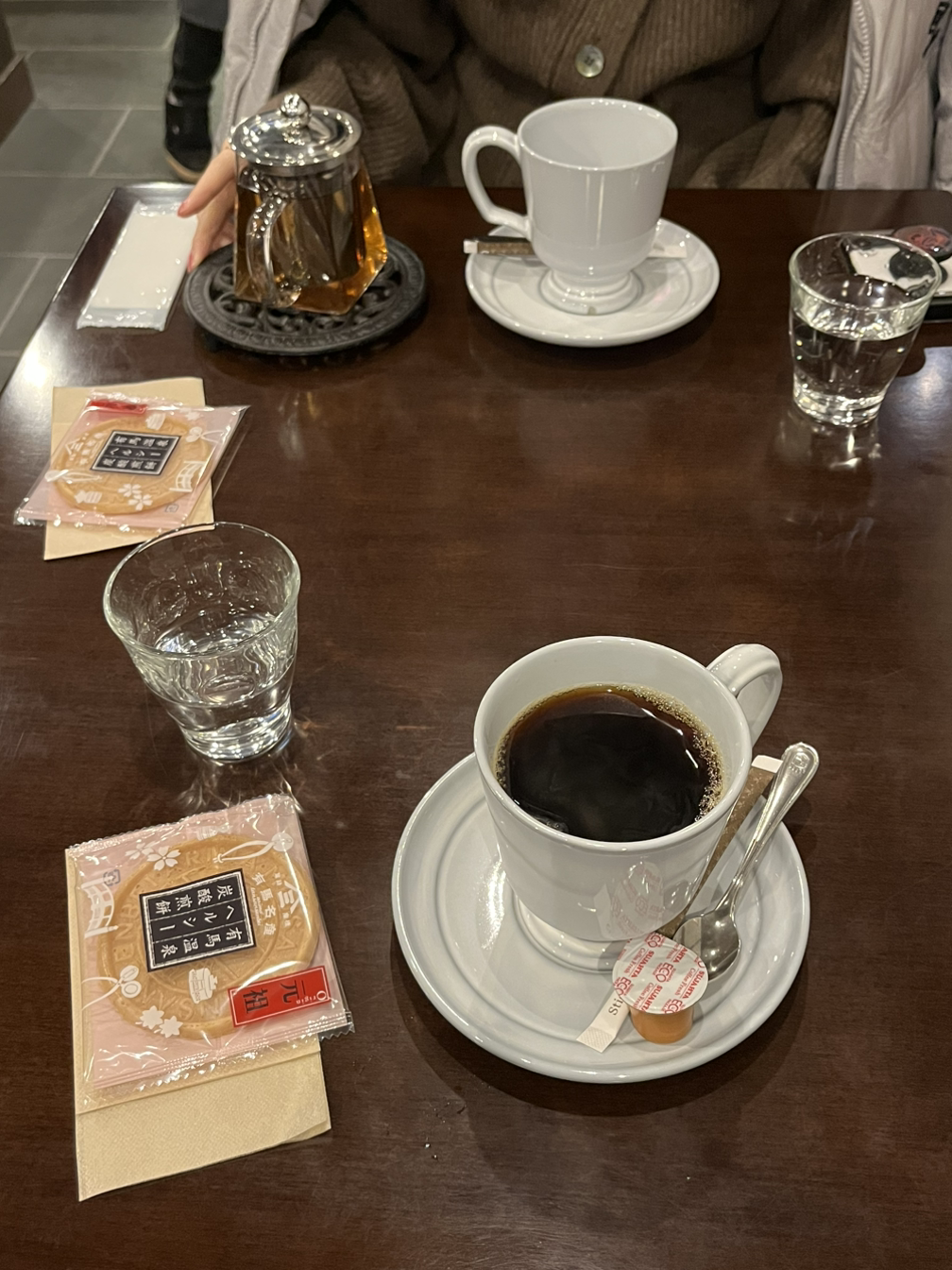 따뜻한 차와 커피를 주문했더니 이 동네 명물인 탄산센베를 하나씩 주셨다.