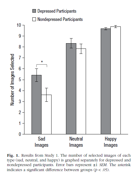 그 결과 우울한 참가자들이 그렇지 않은 참가자들에 비해 슬픔을 유발하는 사진들을 보기를 더 선호하였고, 행복을 유발하는 사진들을 선택하는데 있어서는 우울한 참가자들과 그렇지 않은 참가자들 간의 차이가 없었다.
