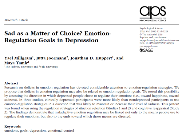 Millgram, Y., Joormann, J., Huppert, J., & Tamir, M. (2015). Sad as a matter of choice? Emotion-regulation golas in depression.Psychological science, 26(8), 1216-1228.