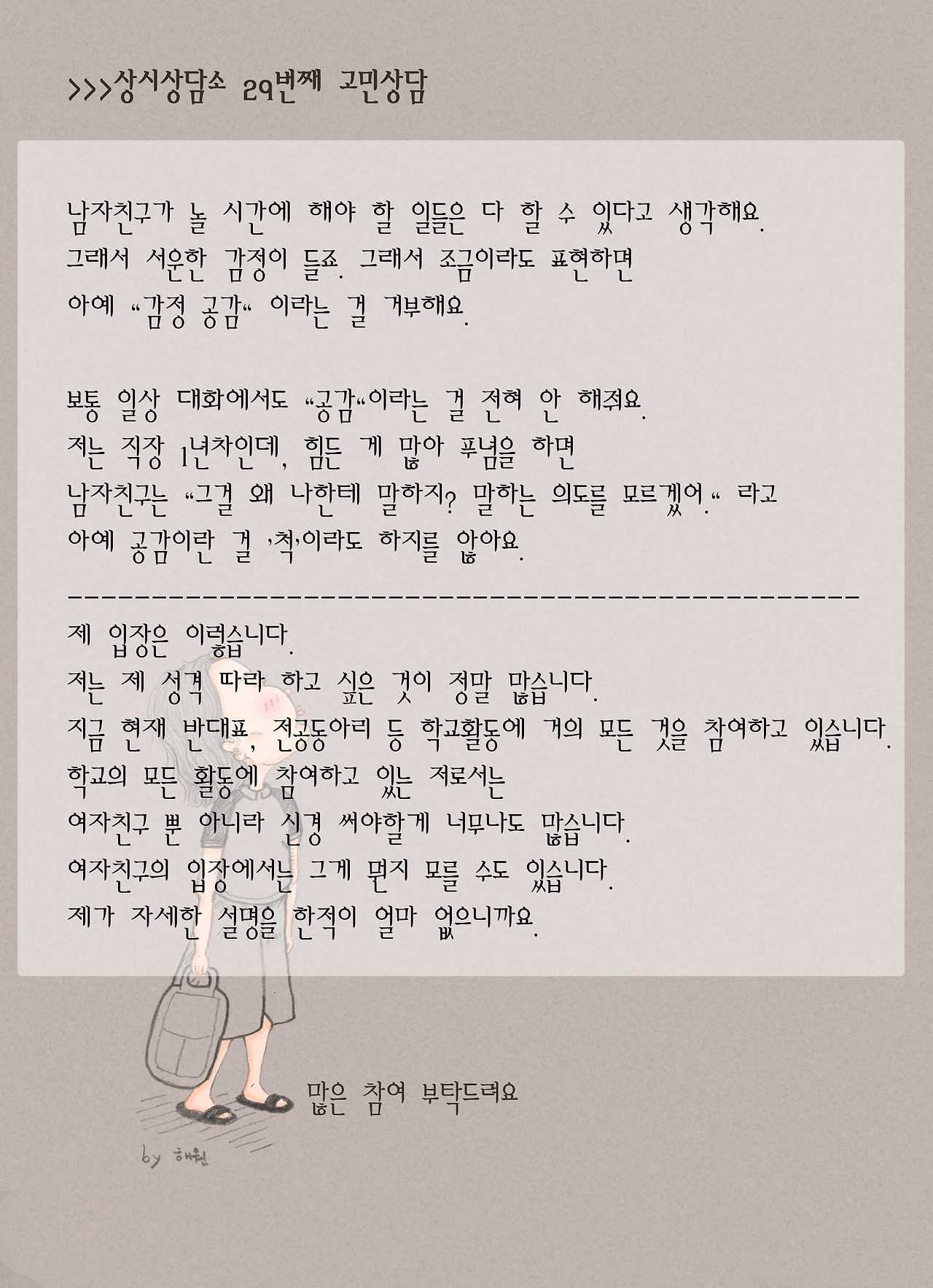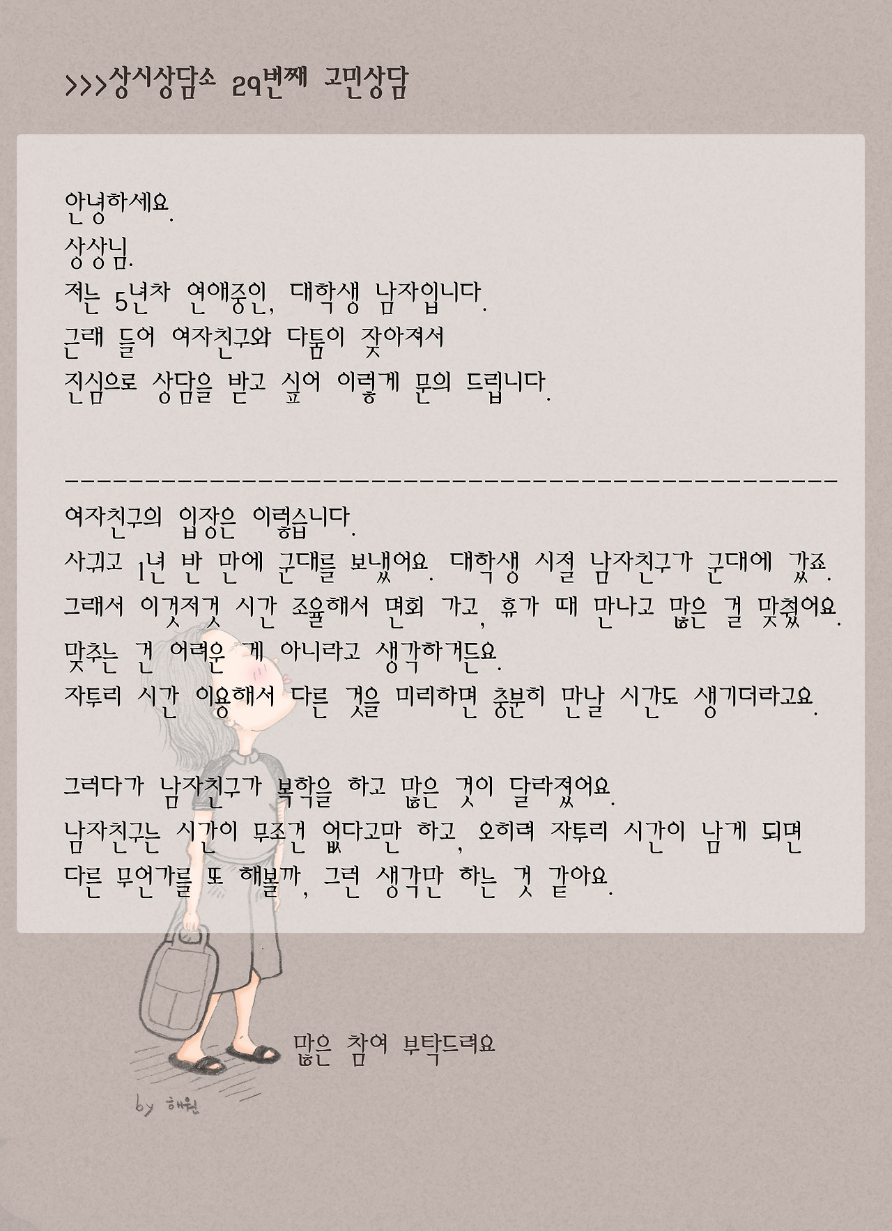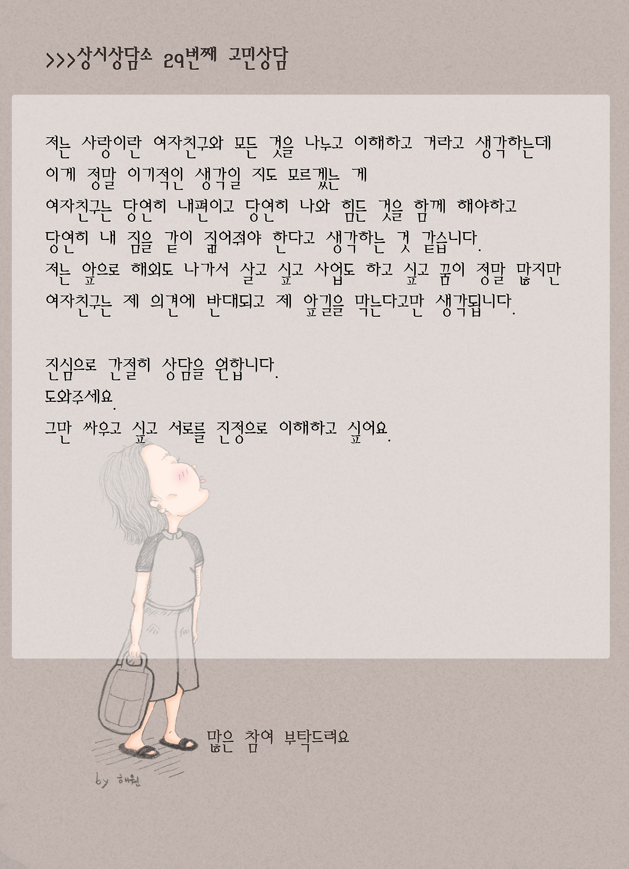 두 남녀의 다른 입장차.서로 좁힐 수 있을까요?