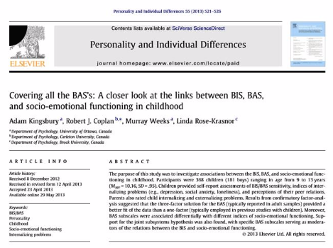 Kingsbury, A., Colpan, R. J., Weeks. M., & Rose-Krasnor, L. (2013). Covering all the bas's: a closer look at the links between bis, bas, and socio-emotional functioning in childhood. Personally and Individual Differences, 55, 521-526.