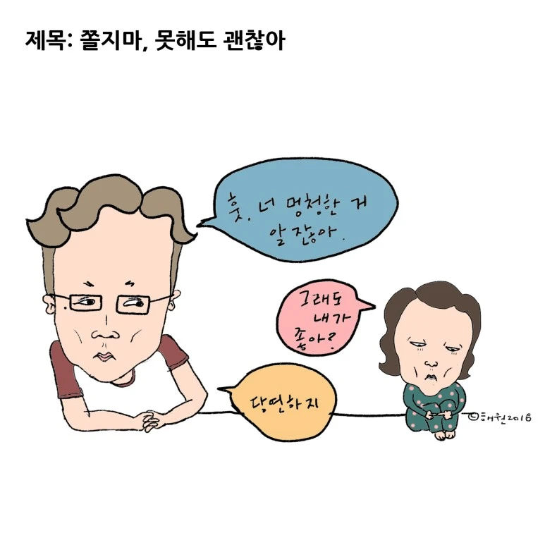 또 누군가는 "잘하지 못해도 괜찮아."라고 말하는 게 뭐가 어렵냐며 본인도 할 수 있다고 한다. 하지만 누군가의 실행 능력이 나에게 금전적. 물리적 손해나 피해를 입히는 상황에서 누구나 그 말을 쉽게 할 수 있냐고 묻고 싶다. 나의 대답은 '아니올시다'이다.