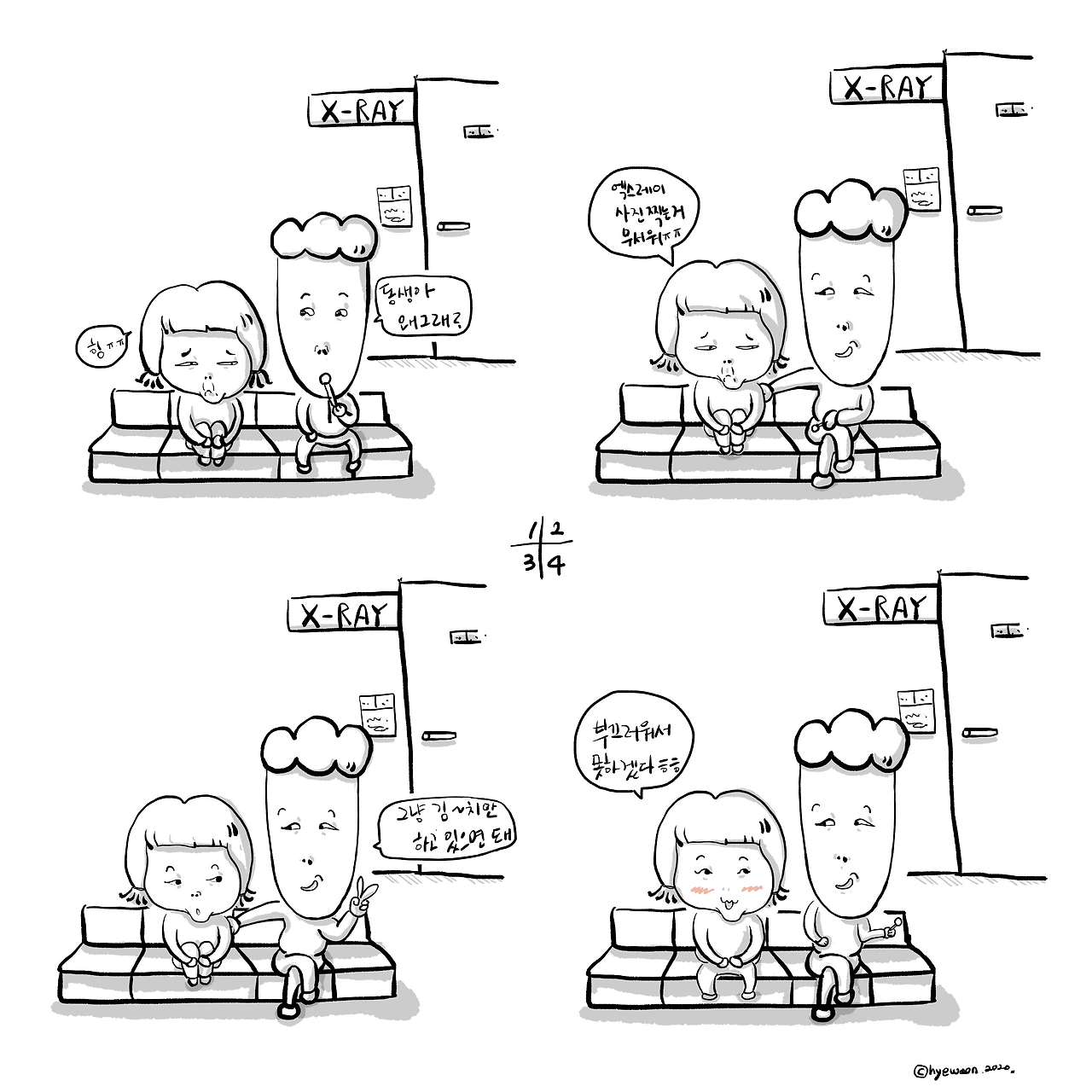 엑스레이 찍기 전 무서움에 떨던 동생의 긴장감은 오빠의 말 한마디에 재미난 긴장감으로 그 색깔이 변했다.