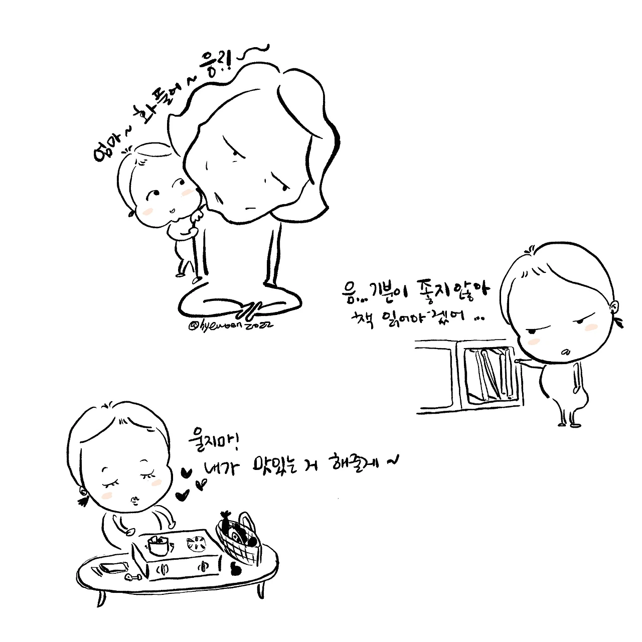 아이가 짜증을 낼 때 ‘그만해!’, ‘적당히 좀 해!’, ‘조용히 좀 해!’ 뭐 별의별 맞대응도 자주 했겠지만, 감정이 드러났을 때 우리가 함께 했던 말들을 아이가 먼저 하게 되면 화가 났던 내 기분도 풀어지고, 좋아지고 그런다. 내가 화를 내면 아이가 묻는다. “화났어? 화 풀어~. 화 더 풀어~”