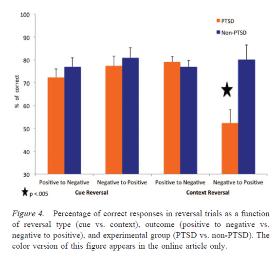 그러나 PTSD 환자들만 부정적인 맥락(긍정적일 때는 예외)에서 뒤바뀐 결과를 학습하는데 선택적인 결함을 보였다. 이들은 특정한 맥락을 부정적인 결과와 연합하는 것을 학습한 후(예, 노란색 배경의 자동차는 부정적이다), 나중에 새로운 사물이 제시될 때 긍정적인 결과가 나온다는 것을 학습할 수 없었다(예, 노란색 배경의 축구공은 긍정적이다).