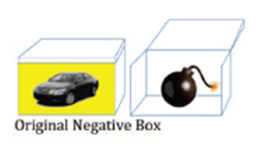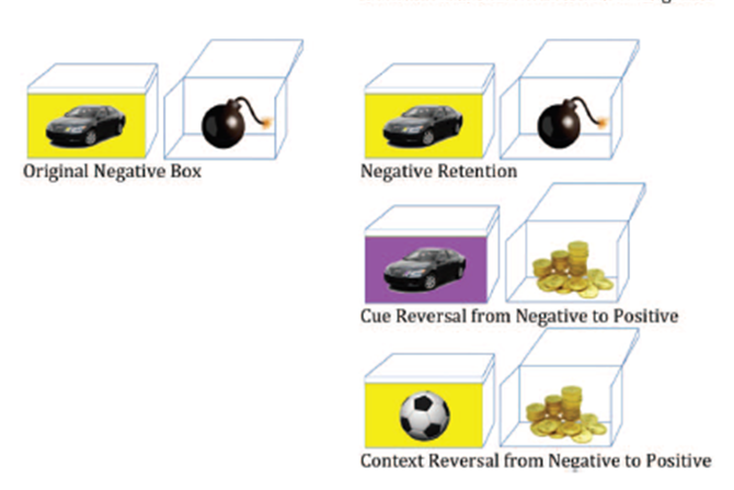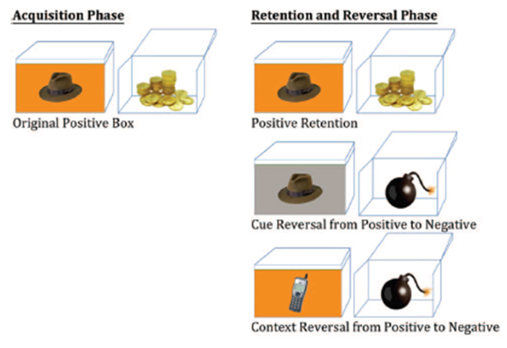 본래 부정적인 상자: 노란색 배경에 자동차 그림이면 부정적인 결과(폭탄)가 나왔다. 이를 학습한 후 유지할 수 있다면 노란색 배경에 자동차가 나왔을 때 부정적 결과(폭탄)가 나올 것이라고 예상하고 상자를 열지 않을 것이다. 반면, 반전 단계란, 노란색 배경에서 -> 보라색 배경으로 변경이 되거나, 자동차에서 -> 축구공으로 단서가 바뀌었을 때 긍정적 결과(돈)가 나타나고 이는 점수를 얻게 되는 것이니 상자를 열어야 한다는 것을 학습해야 한다는 것이다.