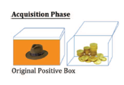 2. 실험 단계: 8개의 단서(폰 or 축구공)와 8개의 맥락 색상(보라색 or 회색)을 새롭게 제시해서 새로운 학습을 하게 되는데 이는 획득 및 반전 단계로 나뉜다. 획득 단계는 새로운 4개의 상자들에 대한 결과를 시행착오를 통해 어떤 결과가 나오는지 학습하게 되고, 이 학습에 따라 상자를 열지 말지 결정하게 된다.