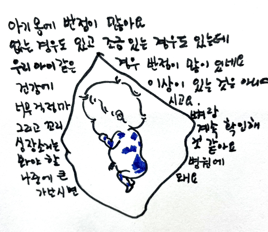 신생아 때는 아이 몸에 있는 반점을 보며 미안한 마음을 금치 못했다. 임신했을 때 내가 무엇을 잘못했나, 피부가 만들어질 때 멜라닌 색소가 피부 속으로 못 들어가서 생겼다는데 내가 어떻게 해야 했을까. 뭐 이런저런 고민을 했다.