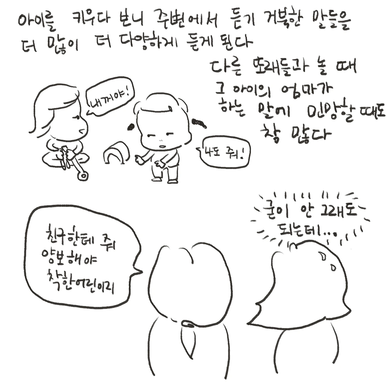 착한 어린이가 되기 위해 양보하고 배려하는 게 아니라 같이 잘 어울리기 위한 사회적 선택이었는데 그 의미와 자유를 퇴색시킨다.