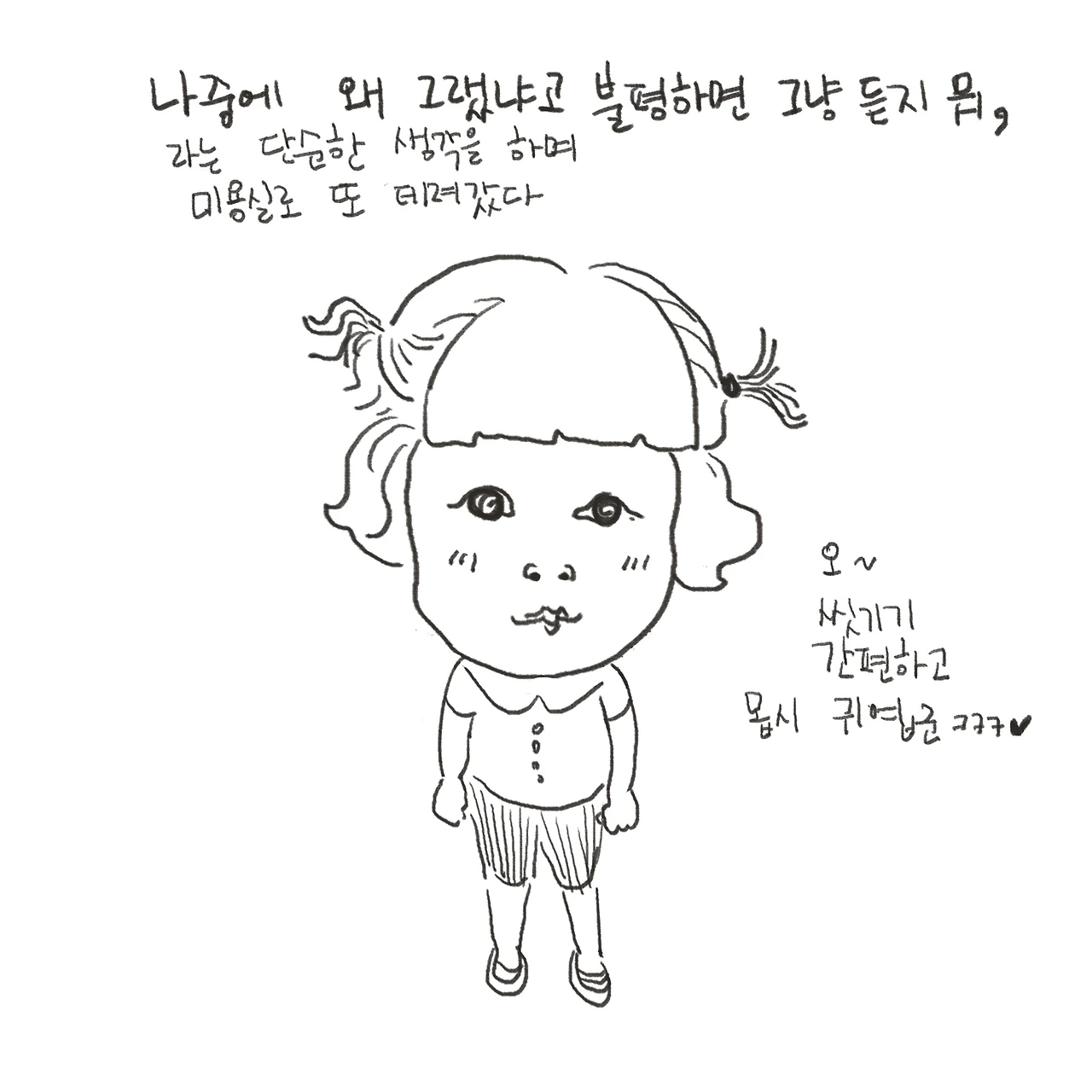 현실적으로 아이를 꾸미기 위해 들이는 내 시간과 내 노력이 아깝다. 그저 편하고 간단한 게 제일이다. 그래야 내 몸이 편하고 내 기분이 상하지 않으니 말이다. 내 기분이 좋아야 아이와도 재밌게 놀 수 있다는 게 내 철칙이다. 부지런하고 에너지 많은 부모는 할 수 있을지 몰라도 나는 아니다.