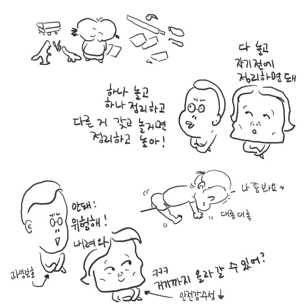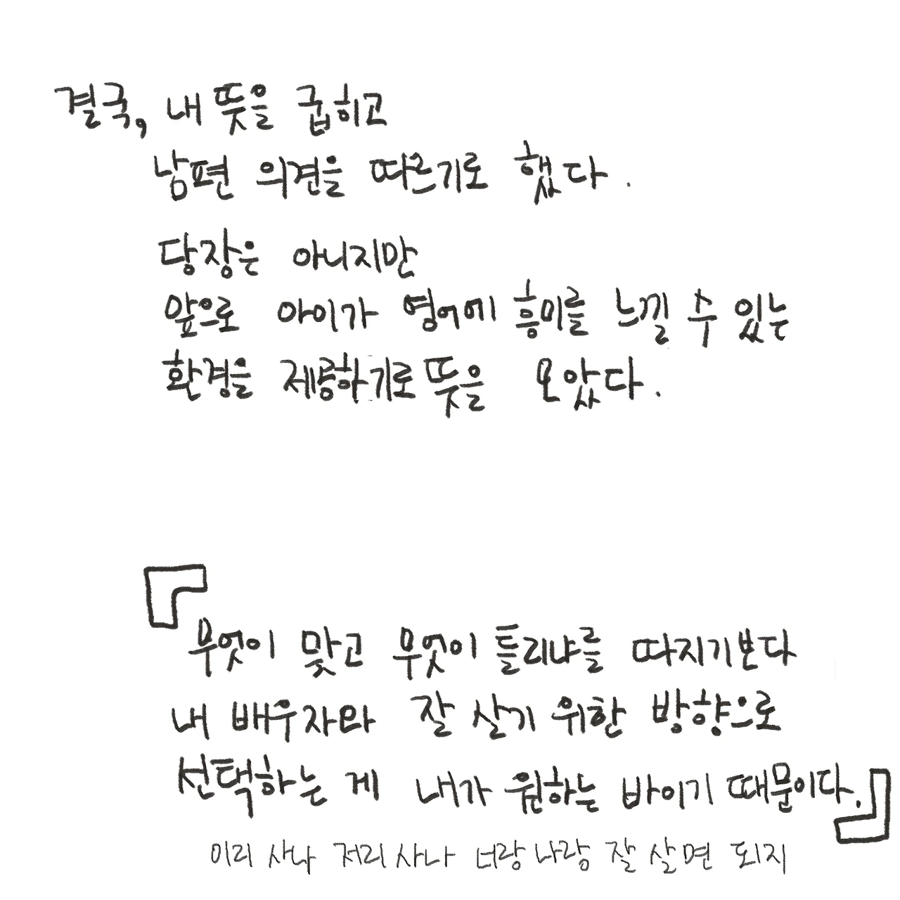 내 생각이 옳고 남편 생각이 고리타분하다고 생각하는 것 또한 내 위주의 판단일 것이다. 내가 남편과의 관계에서, 아이와 함께 하는 이 공간에서 바라는 바는 갈등이 아니다. 남편과 싸우기를 바라지 않는다. 그렇다면 내 생각만 옳다고 주장할 게 아니라 남편이 주장하는 바에 대해 이해해 볼 필요가 있었다. 저 사람의 입장 말이다. 그리고 나의 안위나 행복에 크게 타격이 없는 일이라면 남편의 뜻을 따르는 것도 나쁘지 않은 것 같다. 물론 아이와의 관계에서도 마찬가지.