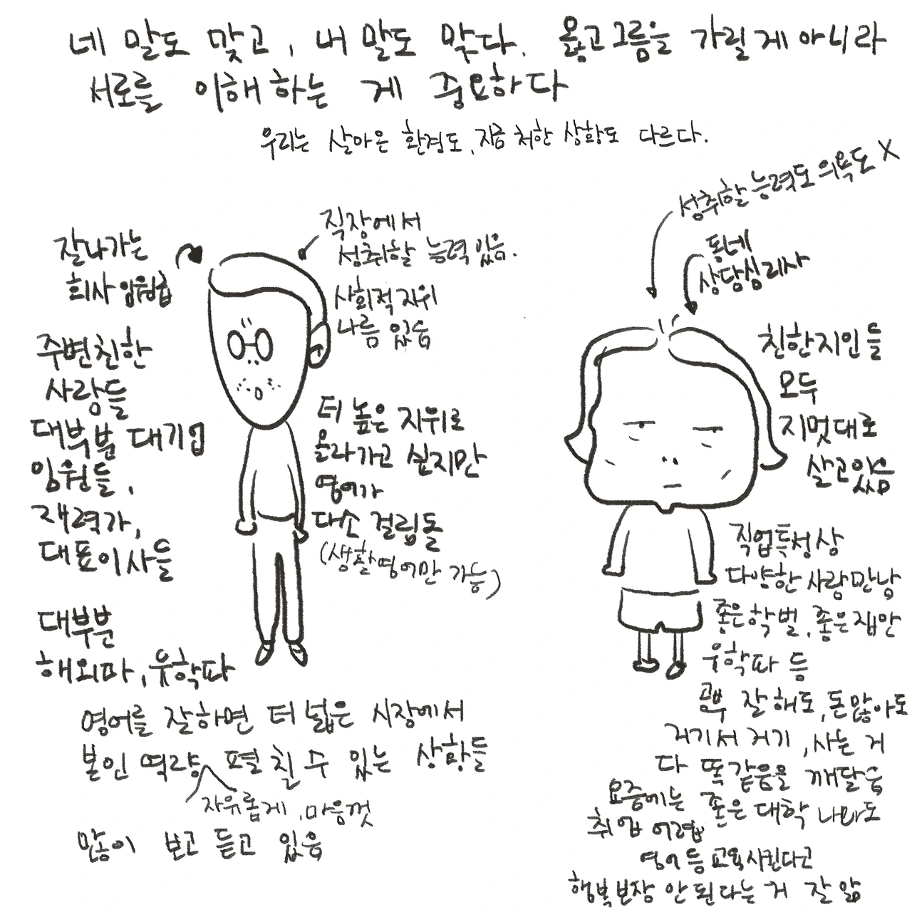 결혼하고 나서 알았다. 이렇게 사사건건 의견이 대립할 수 있다는 것을. 성장 배경이나 현재 처한 환경이 다르기에 당연하겠지만 꽤 피곤한 일이다. 연애 때는 서로 간의 애정도를 의심하느라 갈등이 생긴다면 결혼 후에는 가치관 충돌로 갈등이 생긴다. 특히 아이를 키우고, 부모님을 모시는 경우에 더욱 그렇다. 내가 아이를 대하는 방식, 집안일, 바깥일을 대하는 방식이 배우자와 같지 않다면, 그리고 서로 자기 방식이 옳다고 주장한다면 그 갈등은 해결되지 않는다.