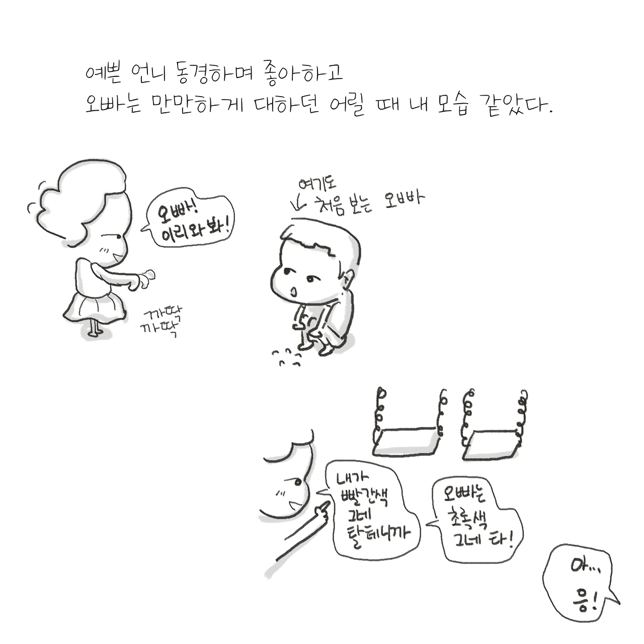 그러니까 이 세상 모든 부모들 괜한데 힘쓰지 말고 그냥 내 새끼는 나랑 별반 다르지 않게 클 거라고 인정하고 살았으면 좋겠다. 불가능한 기대 하느라, 쓸데없는 미래 걱정하느라 눈앞에 아이와 씨름하며 힘 빼지 않았으면. 그러면 매부 좋고 누이 좋고. 아이는 간섭 안 받아서 좋고, 나는 화 안내서 좋고.