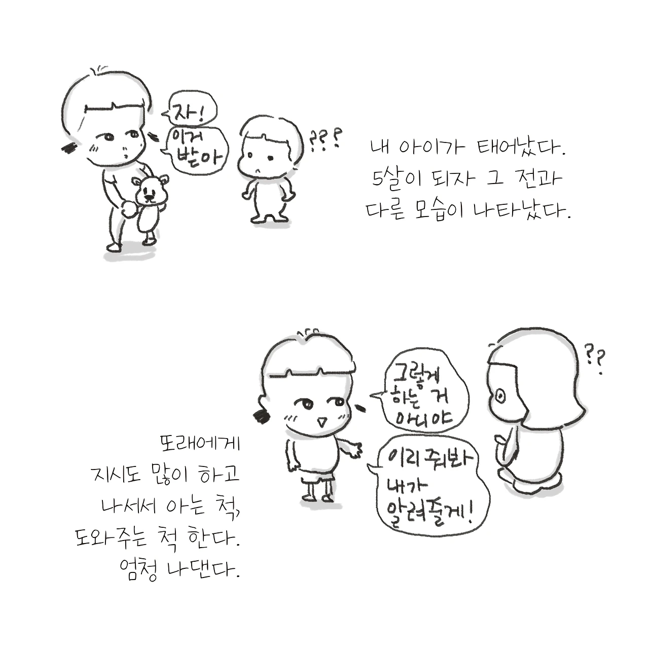 이래서 아이를 바꾸려는 노력 따위 하지 말아야 한다. 아이 모습이 못마땅해도 이해하고 인정해줘야 한다. 어차피 다 정해져서 태어났으니까. 게다가 아이 모습에서 내가 싫어하는 그 모습은 내 모습일 가능성이 크니까. 내 모습 중에 내가 싫어하는 모습을 아이가 보이면 그렇게 싫을 수가 없다. 하지만 바꿔 생각해 보면 나도 변하지 못했으면서 어찌 아이에게 그 가혹한 요구를 할 수 있냐는 말이다. 오늘도 역시나 떠오르는 생각. 생긴 대로 살 수밖에 없다! 서로 힘 빼지 말자.