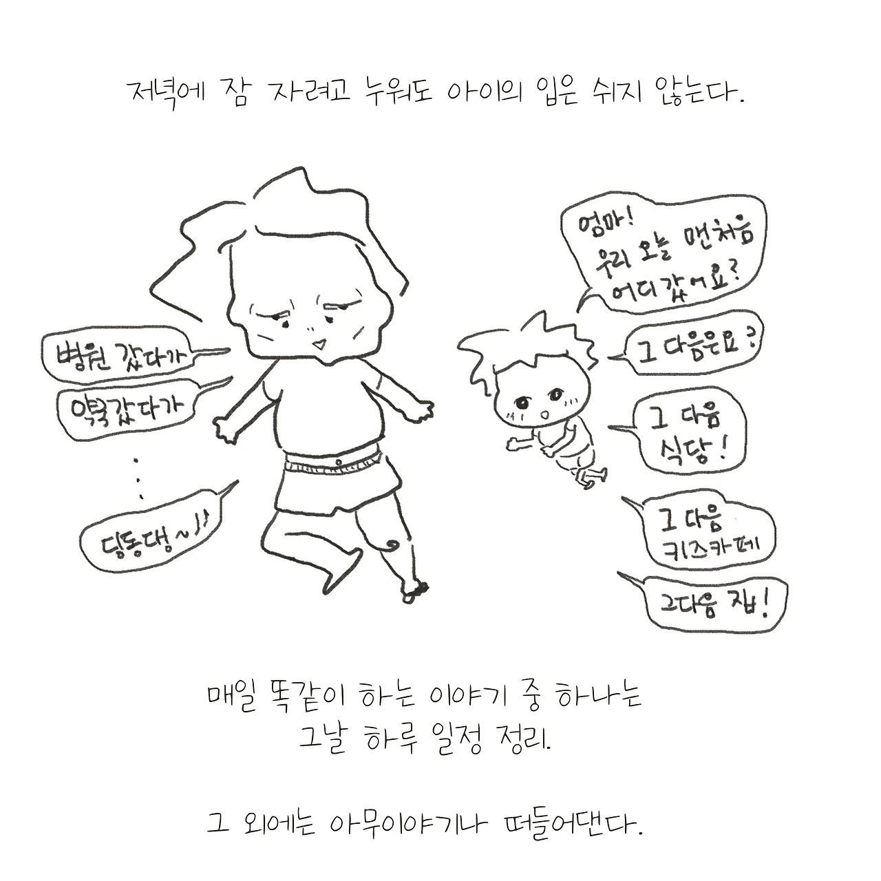 이제는 제법 말을 잘하게 돼서 언어로 직접 표현한다. 그날 하루 어떻게 시간을 보냈고, 누구를 만났는지 한 번 쫙 훑고 나서 잠이 든다. 아침에 일어나자마자 하는 일도 어제 무엇을 했는지 상기하는 일이다. 대체적으로 주말이나 휴가 등 아침부터 저녁까지 함께 시간을 보냈을 때 복기하는 편이다.