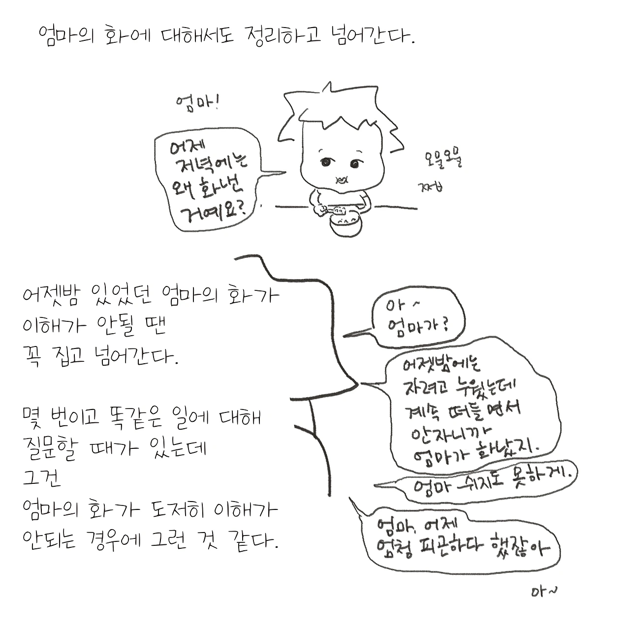 있었던 일들 중에 엄마의 화도 들어가 있다. 엄마가 왜 화를 냈었는지 묻는다. 이런 질문을 통해 엄마가 본인에게 화를 낸 것에 대해 잘못을 인정하기를 바란다고 생각하지 않으련다. 단지 엄마가 화를 냈을 때 본인 기분이 어땠는지 이야기하려고 한다고 생각한다.