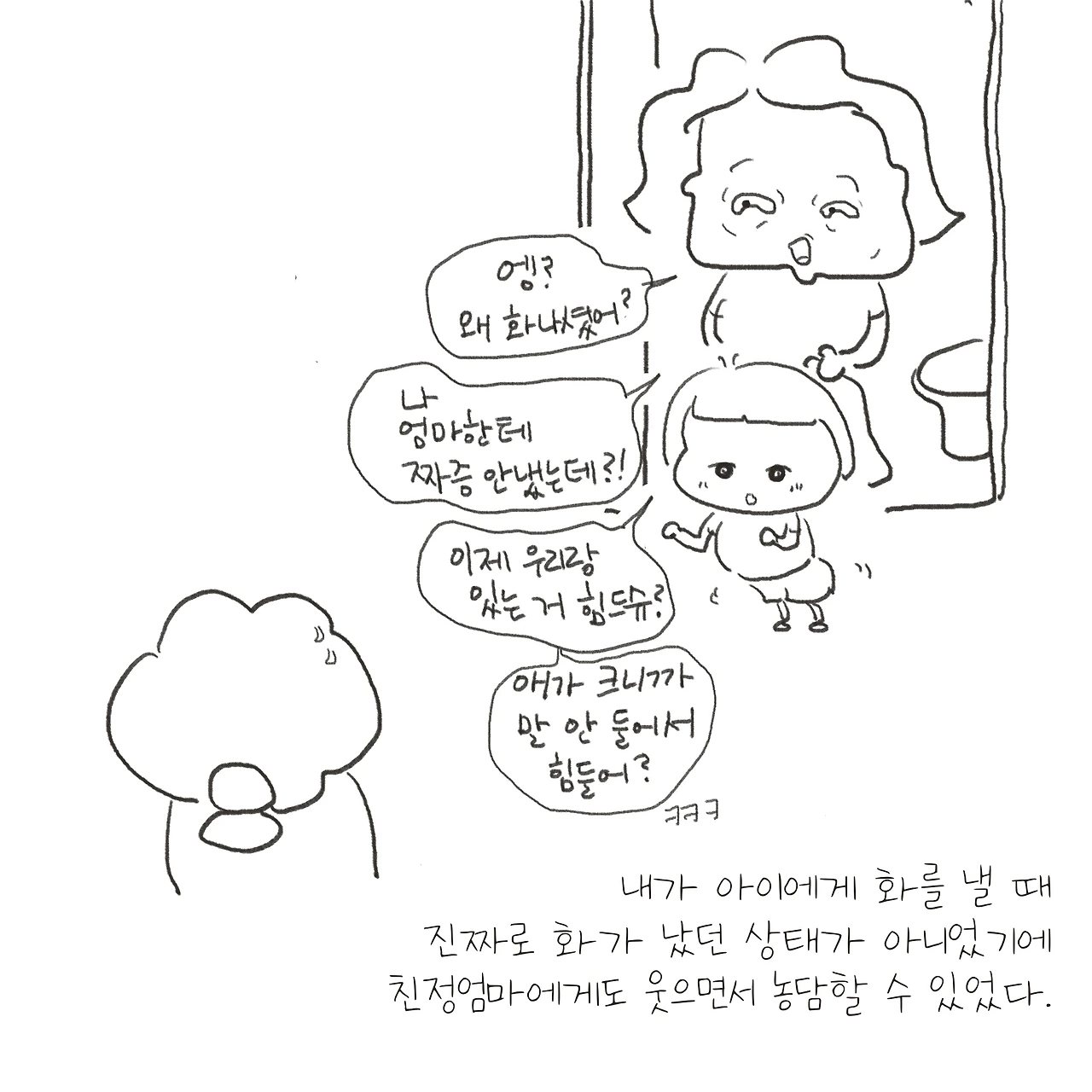 아이의 울음이 난 크게 불편하지 않다. 특히, 해야 할 일을 하지 않기 위해 다른 이유(예, 놀던 거 멈출 수 없다, 졸리다, 등등, 시간 끌기 위한 변명들)를 들며 속상하다 억울하다 우는 것에는 더 흔들리지 않는다. 울음의 이유(예, 시간 끌기 등 자기 뜻대로 하기 위해)가 뻔히 보이기 때문에 그렇다. 하지만 아이에게 화내는 것을 어려워하는 사람들이 있다. 그 이유는 여러 가지가 있는 것 같지만 어차피 같은 줄기에서 나온다.