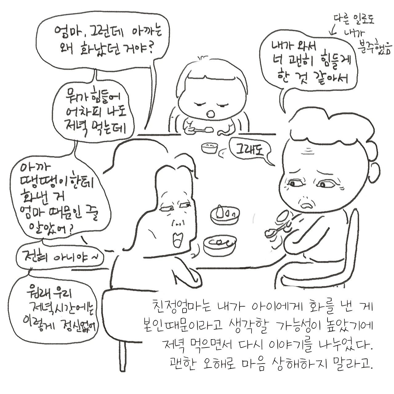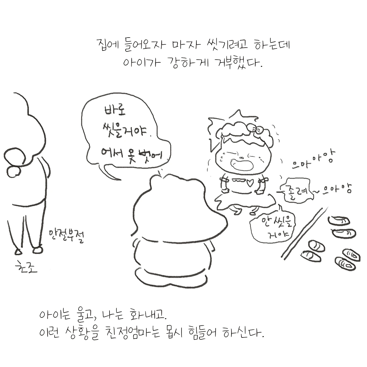 본인이 다른 사람의 반응에 상처(?)를 잘 받기 때문에 그렇다. 그래서 내가 아이에게 화를 내서 아이가 울거나 화를 내면 혹시나 아이가 (나처럼) 상처받은 건 아닐까 쓸데없는 걱정을 한다. 그래서 아이를 울리는 게 그토록 어렵게 느껴지는 것이다.