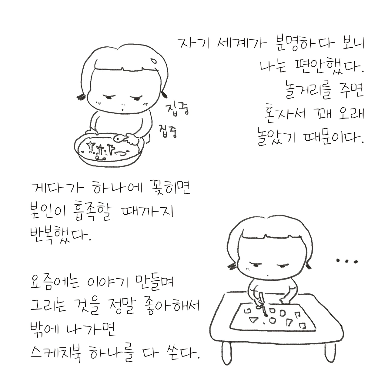 요즘에는 책 만들며 노는 것을 좋아한다. 본인이 좋아하는 것‘만’ 몰입해서 놀다 보니 점점 더 발전하는 게 눈에 보인다.