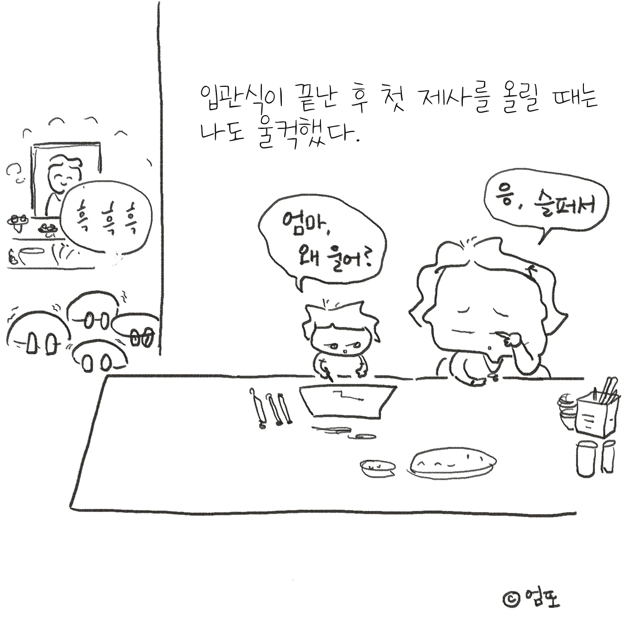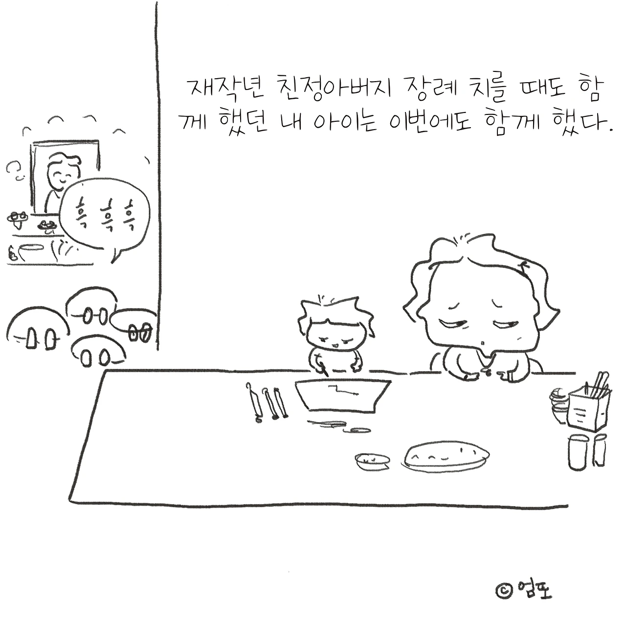 하지만 친정아버지 돌아가셨을 때도, 시할머니 돌아가셨을 때도 아이 맡길 곳이 없어서 나와 함께 있었다.