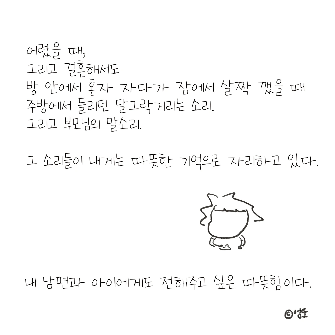그 모습이 내게도 익숙하다. 나 어렸을 때도 우리 엄마는 음식을 하면 꼭 윗집, 아랫집, 그리고 주변 아는 집에 조금씩 가져다주라고 심부름 시키셨다. 오빠 친구 중 부모님이 맞벌이하셔서 집에서 혼자 밥을 먹는 오빠 친구는 우리 집에서 함께 저녁도 자주 먹었다. 거의 매일 함께 있었던 것 같다. 오빠랑 내가 오빠 친구네서 놀고, 엄마가 저녁밥을 그 집으로 가져다준 기억도 있다.