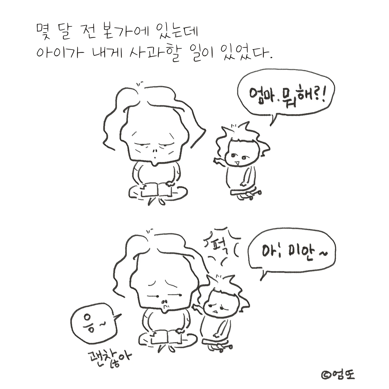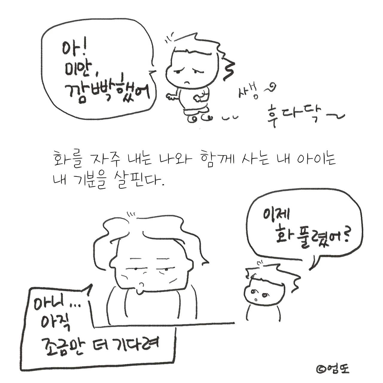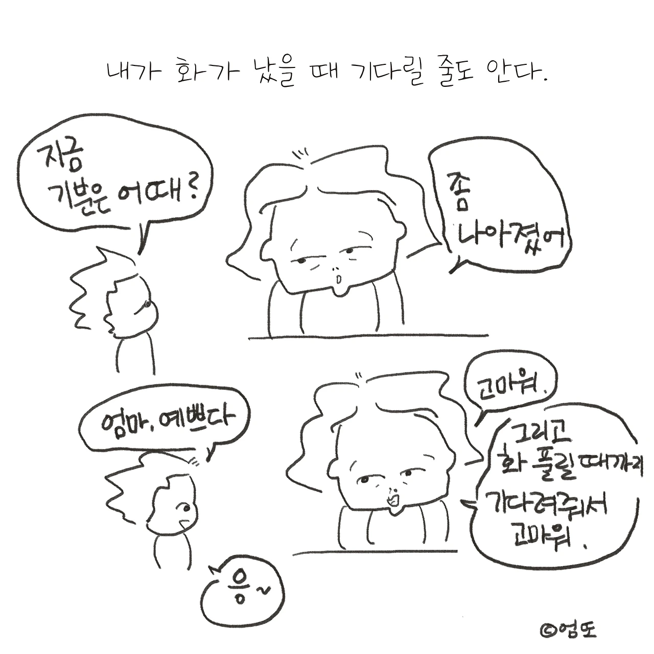 아이에게 왜 화가 나는지 이유를 설명하니까 아이가 나에 대해 많이 알게 되었다. 그러자 점차 화가 나는 일이 줄어들었다. 이제는 그런 상황이 비슷하게 오면 아이가 먼저 말한다. “그렇다고 화내면 안 돼~, 화내지 마, 나 무서워.” 이렇게 말하는 아이 앞에선 웃음이 나온다. 무서웠냐고, 미안하다고. 알겠다고 지금은 화 안 내겠다고. 답을 한다.