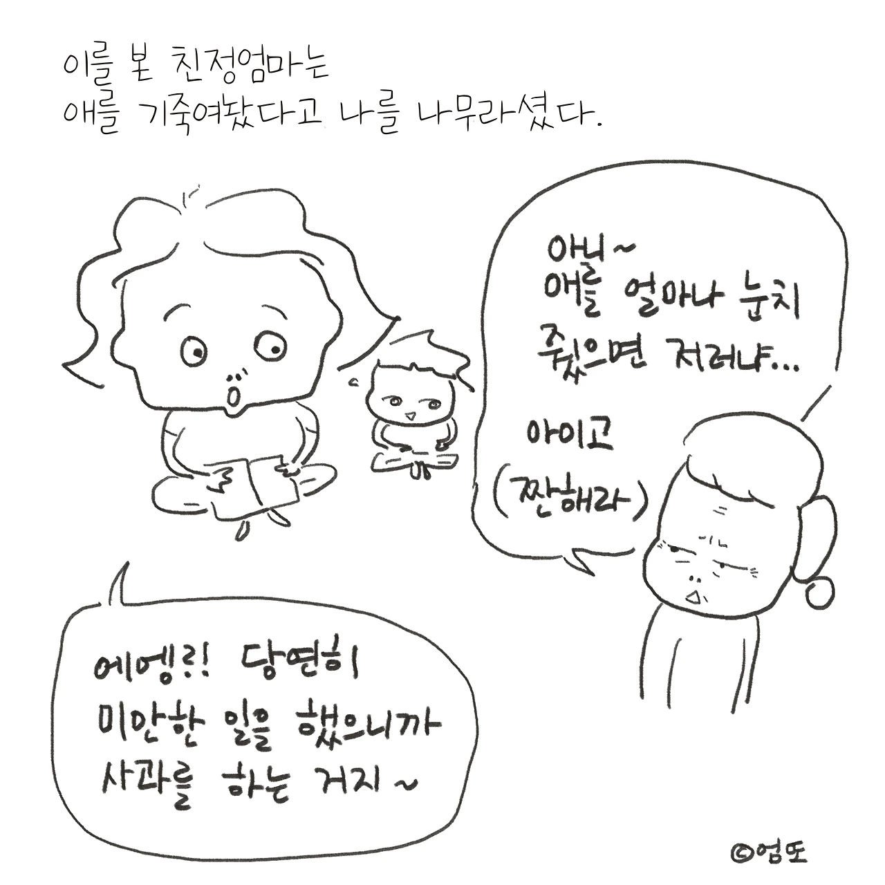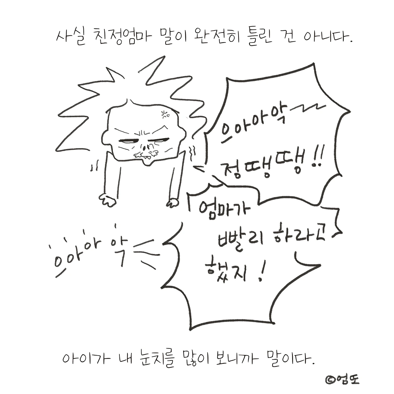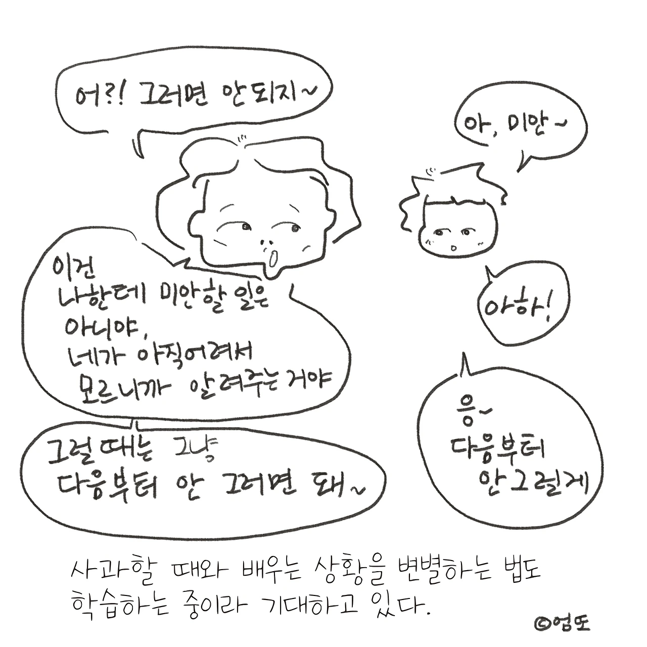 어떤 화 많은 사람을 만나도 내 아이는 당황하지 않을 것 같다. 워낙에 집에서 단련을 많이 해왔으니 말이다. 나는 화를 많이 내는 엄마이기는 하지만, 공갈협박 등 치사한 방법은 쓰지 않는다. 조건도 걸지 않는다. 내가 왜 화가 나는지, 아이가 그 행동을 왜 하면 안 되는지 설명해 준다. 그러자면 꽤 귀찮다. 공갈협박이면 한큐에 끝날 일인데 말이다. 화를 안 내고 설명해 줄 수 있는 그릇을 지니고 있다면 그게 제일 좋겠지만 난 그런 사람이 못되니까 애초에 생각도 안 했다.