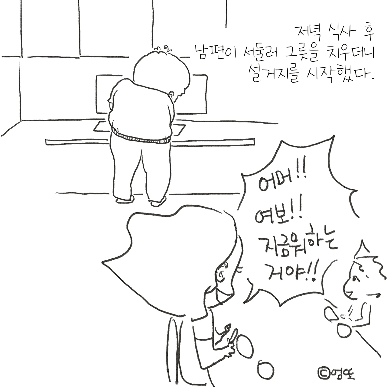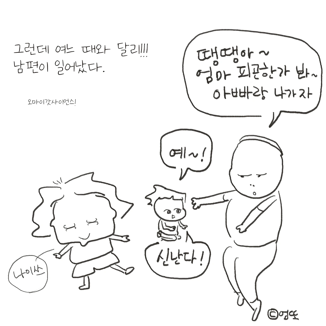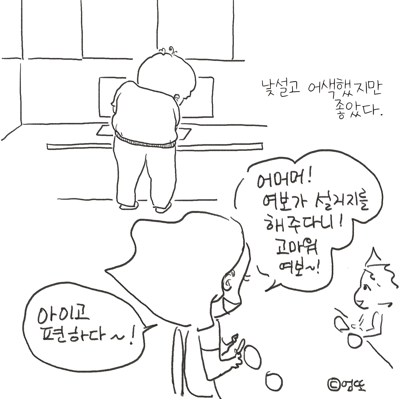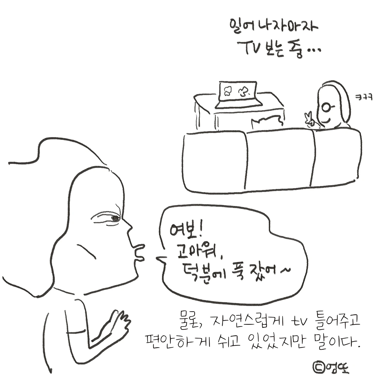 그렇게 묻기만 하고 행동하지 않으면 그 말의 진정성이 떨어졌을 텐데 놀랍게도 그 뒤로 남편이 조금씩 움직이기 시작했다. 물론 소파와 핸드폰과 항. 상. 대. 부. 분. 거.의. 한 몸이지만. 그 몇 번의 움직임이 내 마음을 따뜻하게 해주었다.
