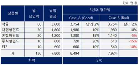 Case-A는 상품군별로 적정한 수준의 수익을 가정했고, Case-B는 손실을 가정했다. 두 경우(Case)의 차액은 570만 원이다. 상품 선택에 다소 실패해 Case-B가 Case-A보다는 적은 금액이 만들어졌지만, 안전자산인 적금과 채권의 비중이 높아 그 이자와 수익 덕분에 원금을 까먹지는 않았다.