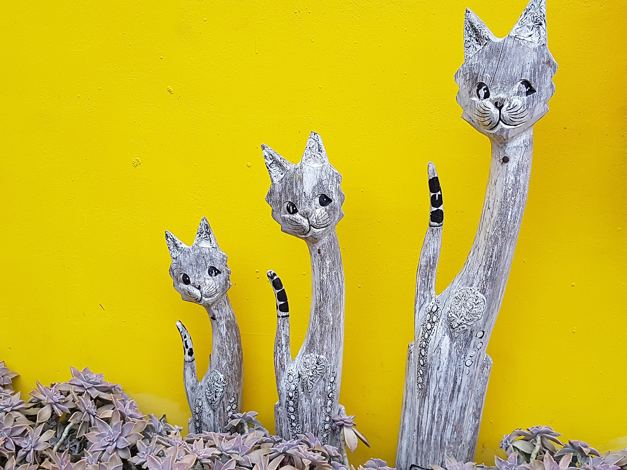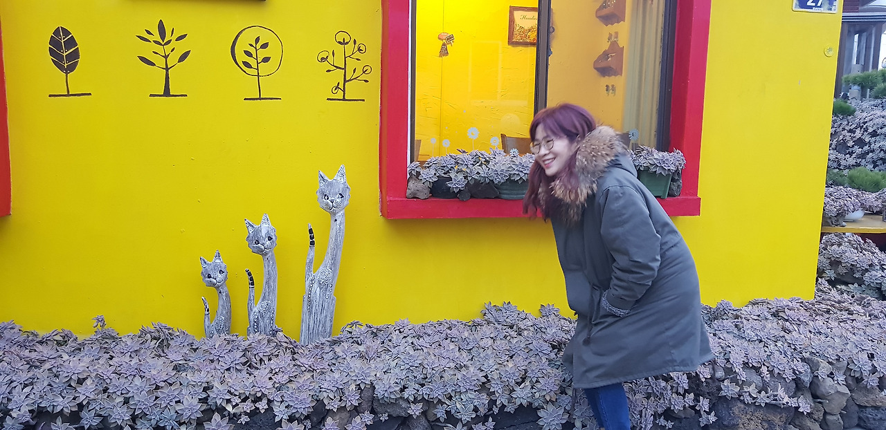 아, 찻집의 담벼락이 노란색, 빨간색이 대비를 이루고 있습니다. 그곳에서 사진을 찍으면 정말 귀엽고 사랑스럽게 보입니다. 고양이 세 마리가 나란히 서 있는 나무 조각도 소품 활용으로 가치를 뽐내고 있구요.