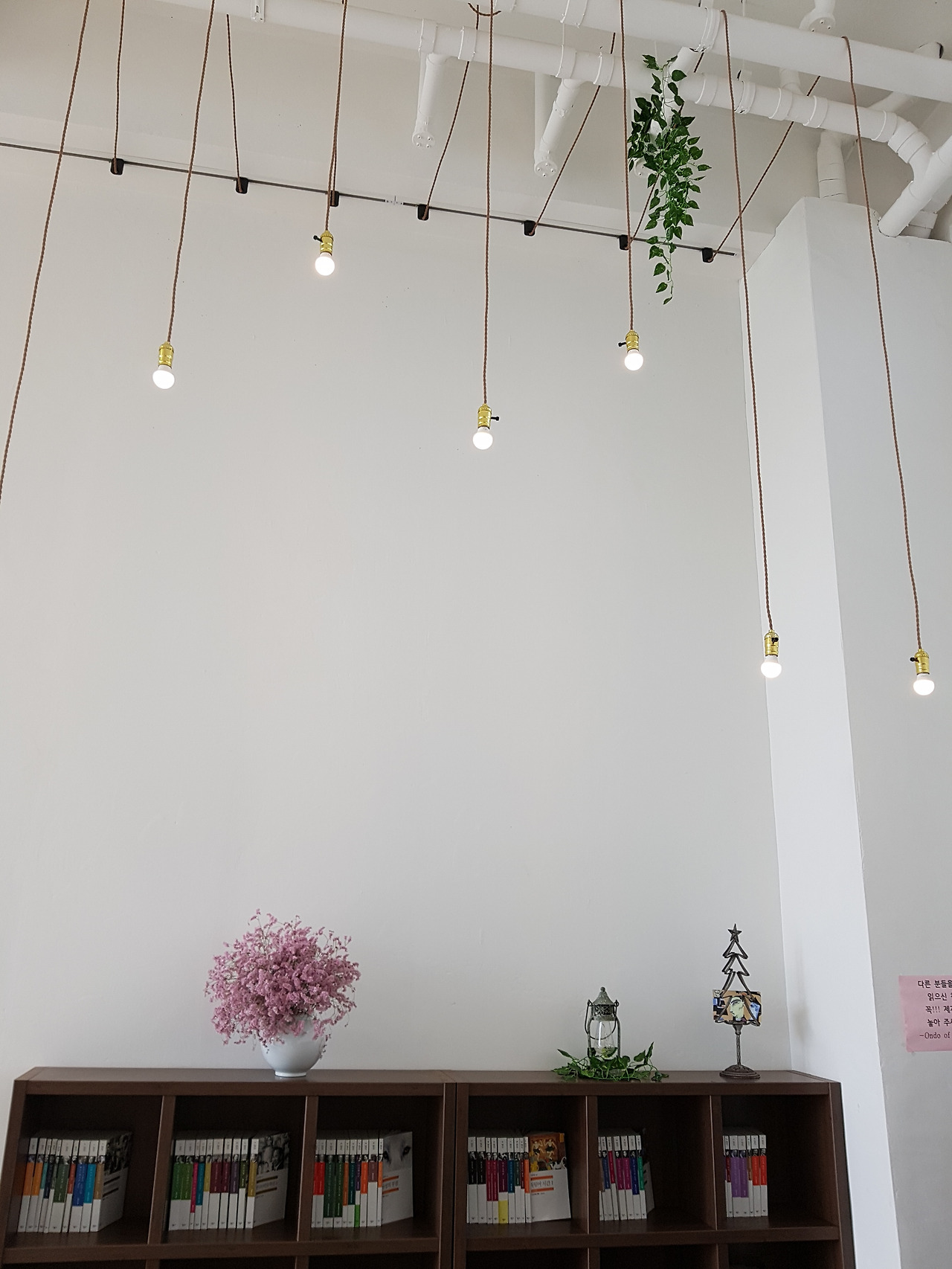 오늘 만남을 시작했던 장소는 전주 혁신 도시에 있는 <그날의 온도>입니다. 그곳은 비싼 찻값만큼이나(기본적으로 7천원이 넘은 듯). 공간도 넓게 넓게 펼쳐져 있고, 천장은 시원 시원하게 높이 올려졌네요. 바깥은 산책 코스처럼 정원이 넓게 꾸며져 있구요. 책도 많이 꽂혀 있네요.