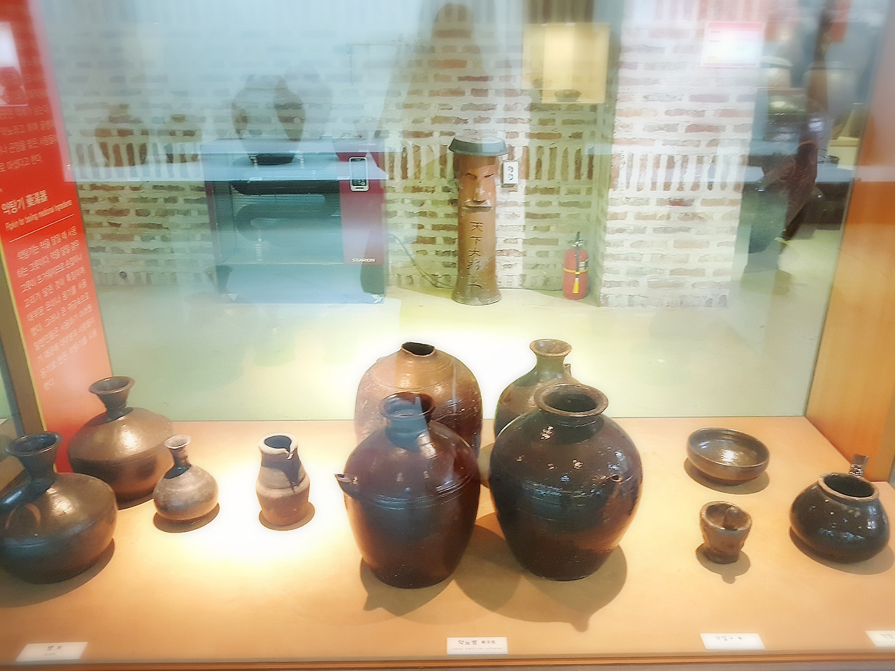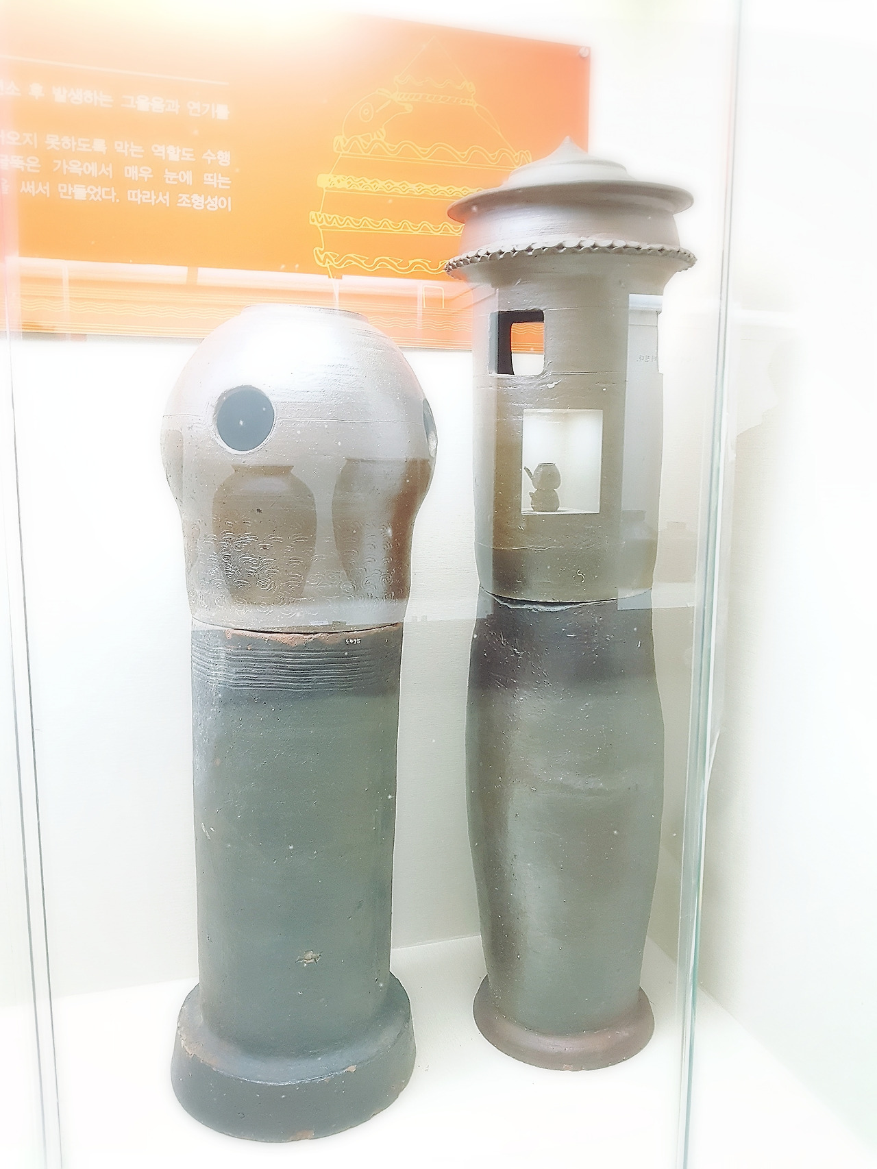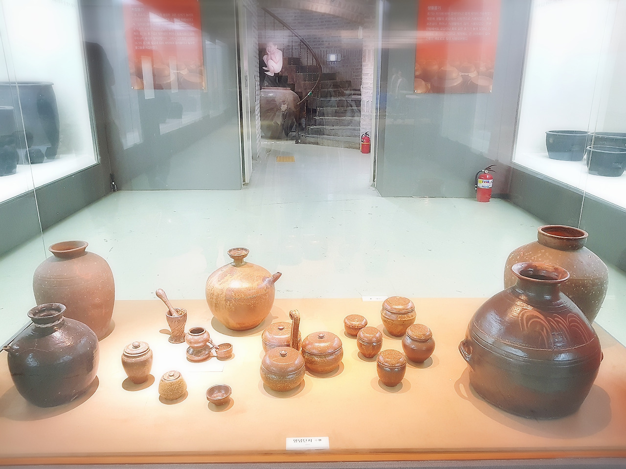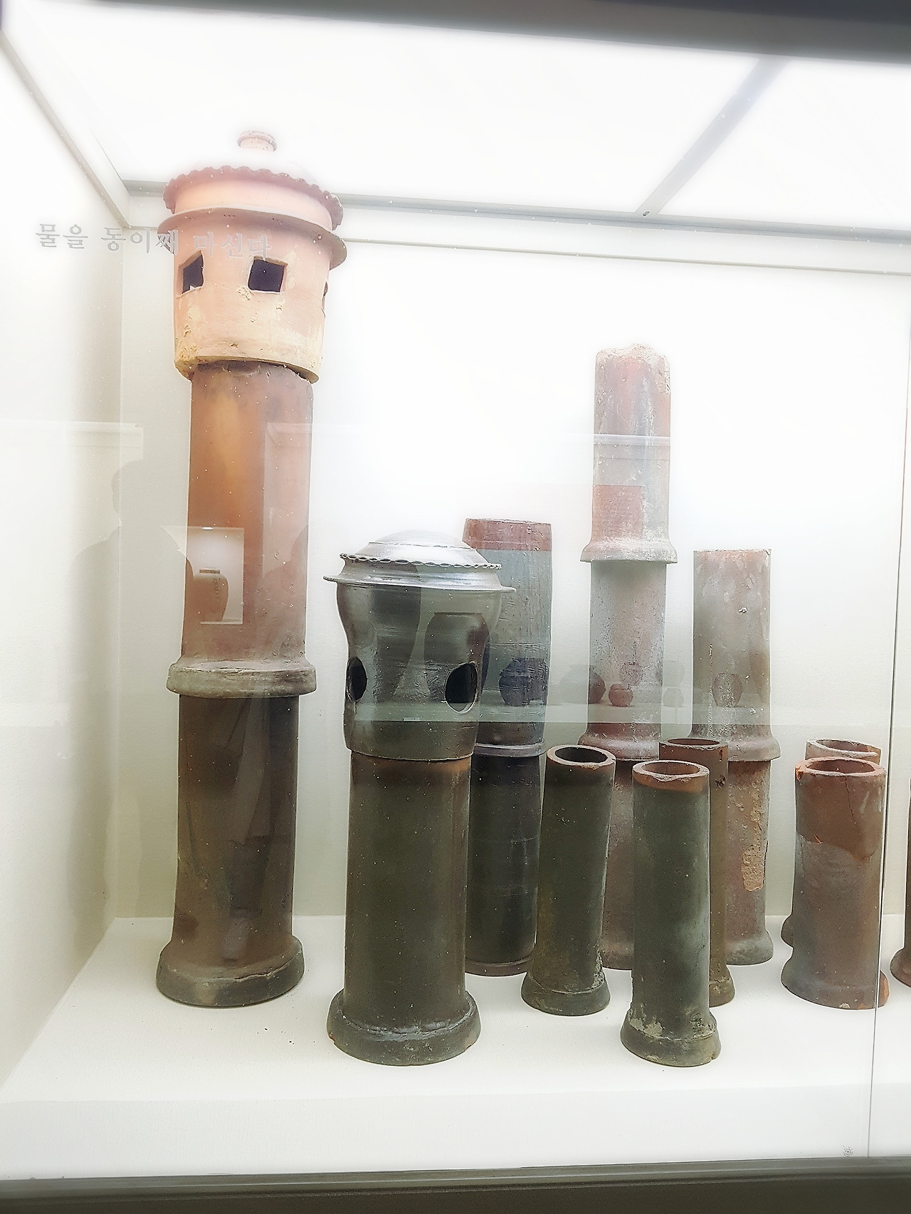 지하 전시관에 전시되어 있는 항아리들, 약탕기, 굴뚝 등등