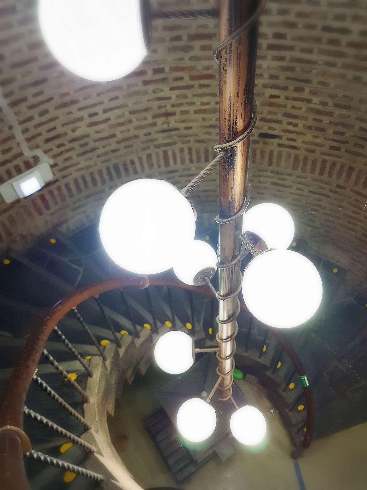 목아박물관은 층층마다 내려가는 계단마저 예술입니다. 안정적인 나선형 구조와 철제 난간, 그리고 하얀 전구등의 배치.