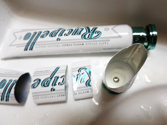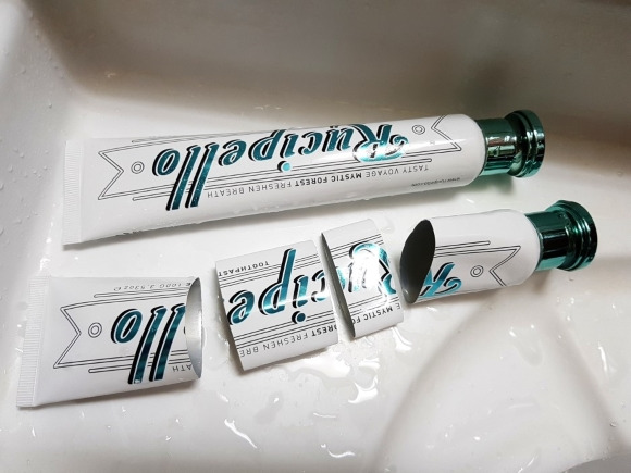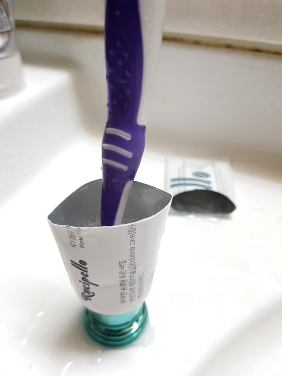 치약을 어느 정도 사용하다 보면. 아무리 짜고 누르고 해도 안 나오는 시점이 있지요. 그때부터는 가운데를 툭 잘라서 쓰시면 됩니다. 자른 단면에도 치약이 많이 묻어 있으니 꼭 사용하시기 바랍니다. 가운데 중심으로 치약을 닦아서 쓰시면 그 또한 며칠 쓸 수 있는 양이 됩니다.