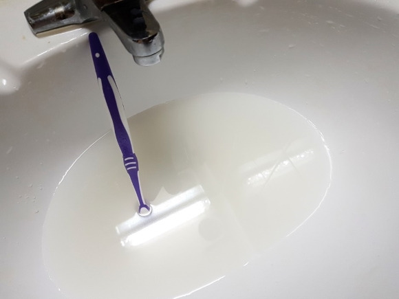 9. 튜브의 꽁지 부분, 뚜껑 부분을 계속 헹구다 보니 치약물이 엄청 많아졌습니다. 낡은 칫솔로 슥슥 삭삭 닦으면서 물을 조금 부었더니 저렇게 더 많아지고 말았습니다.