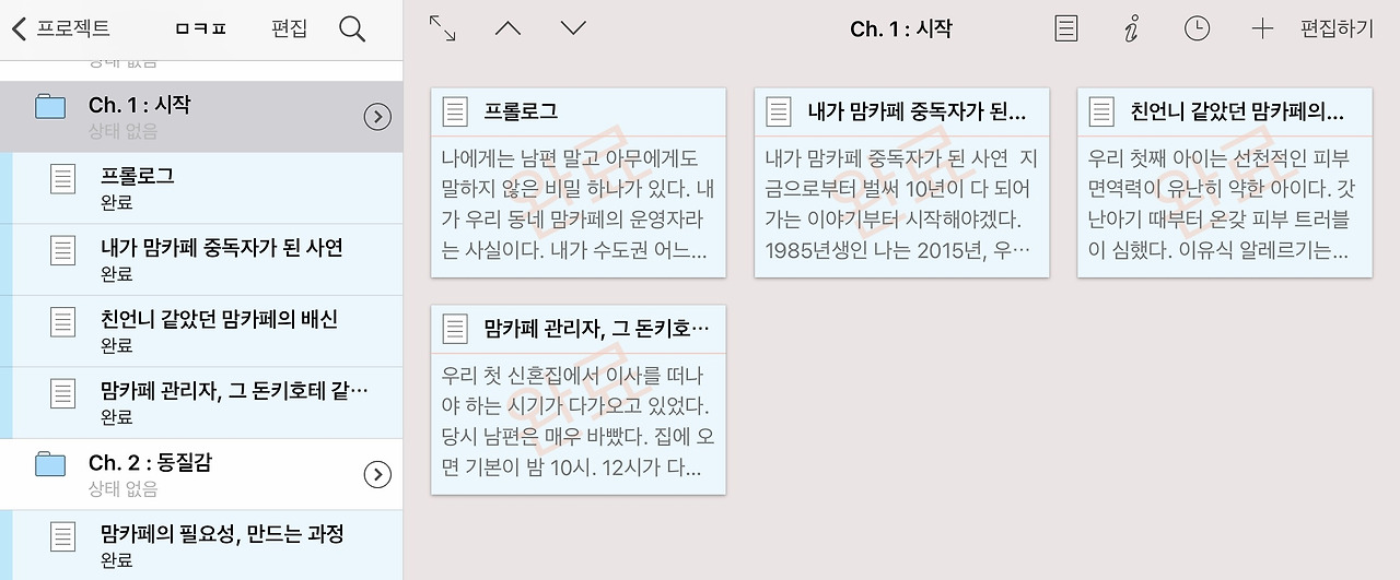 스크리브너는 MS 워드를 사용한다면 너무나 좋을 어플이다. 하지만 결국 한글 프로그램을 만나야 한다면 병행하기 어렵다. 그렇기에 아쉬움이 많이 남으며 다음에도 작업을 한다면 가능하면 MS 워드를 사용하려고 한다.