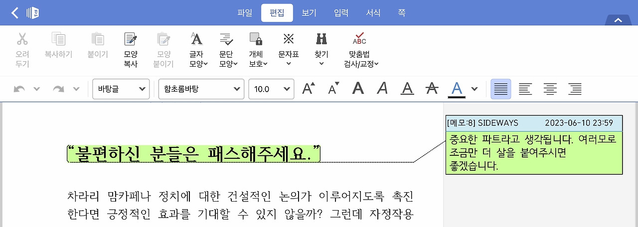 아이패드에서 사용하는 한글 독스 애플리케이션이 무료 버전이라서 큰 기대가 없었다. 그런데 기존 한글 프로그램을 상당히 잘 구현했다. 속 시원하게 한자를 입력할 수 있었고 주석을 잘 적용할 수 있었다.