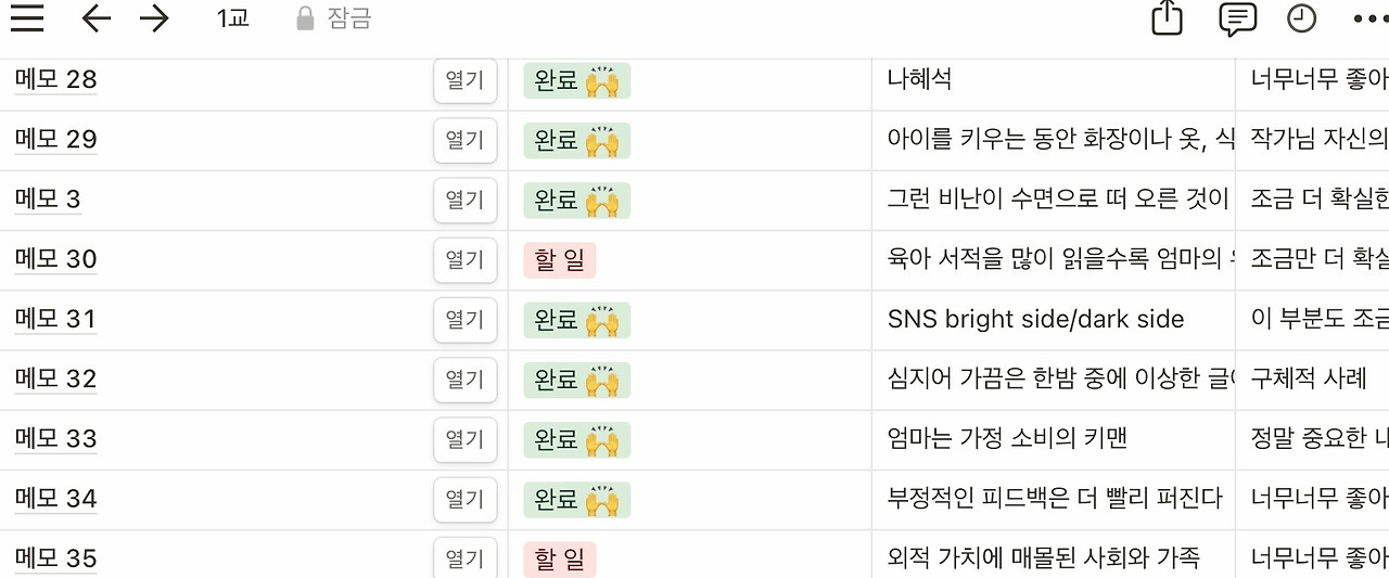 나는 이 유명한 노션을 교안 작업할 때 처음 이용해 봤다. 특정 문장 관련으로 출판사의 피드백에 대한 작업 현황을 한눈에 보려고 사용했다. 각 페이지마다 메모 넘버링을 제목으로 하고, 필터로 작업현황 (할 일, 진행 중, 보류, 문장수정 필요, 완료), 본문 텍스트, 출판사 코멘트, 나의 메모로 값을 만들었다. 내가 이 어플에 대해 제대로 공부하고 활용했으면 이것보다 더 효율적이고 멋진 모양새로 만들 수 있었겠지만 나에게는 시간이 부족했던지라 우선 되는대로 만들어 작업했다. 그래도 덕분에 개미지옥에 빠지지 않고 훨씬 효율적으로 작업할 수 있었다.