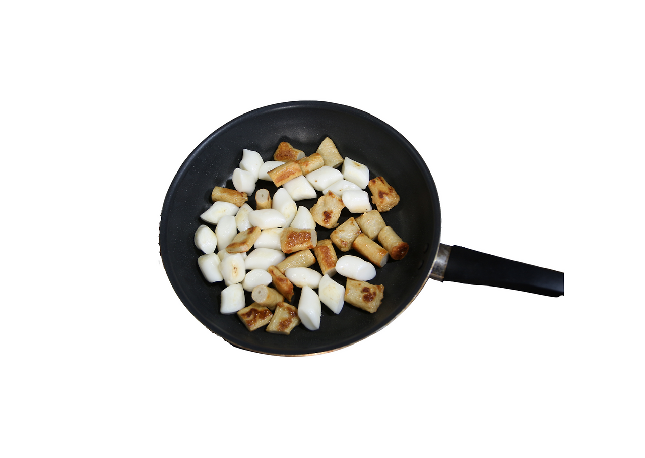 프라이팬에 기름을 두르고 떡과 소시지를 넣어 익힌다.