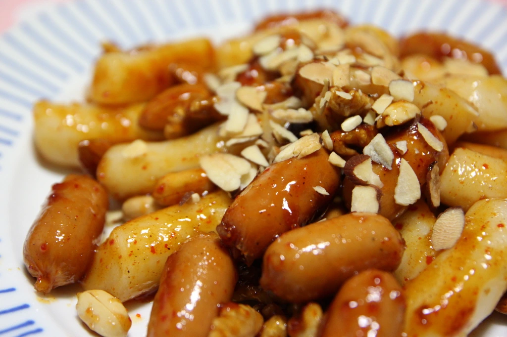 견과류를 뿌린 떡볶음 / 소떡소떡 꼬지에 꽂은 떡볶음