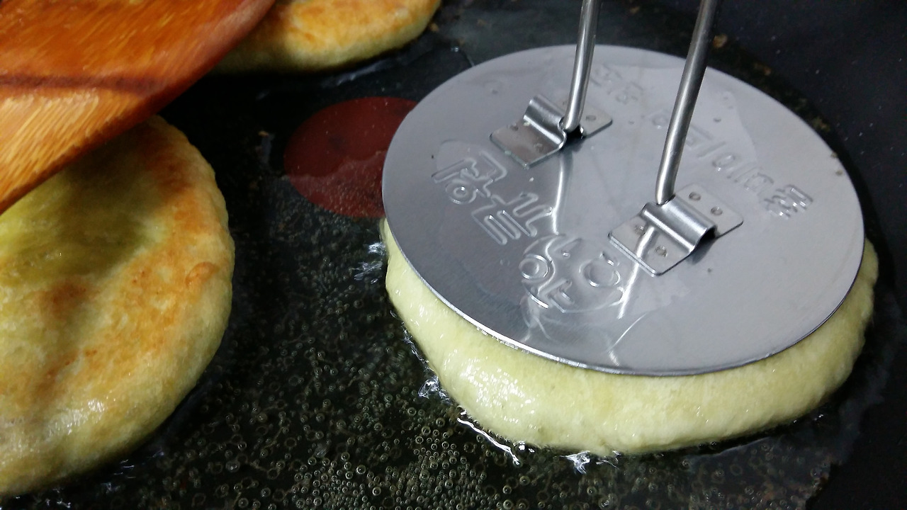 한쪽면이 살짝 구워지면 뒤집어 호떡 누르개로 눌러주며 익힌다.