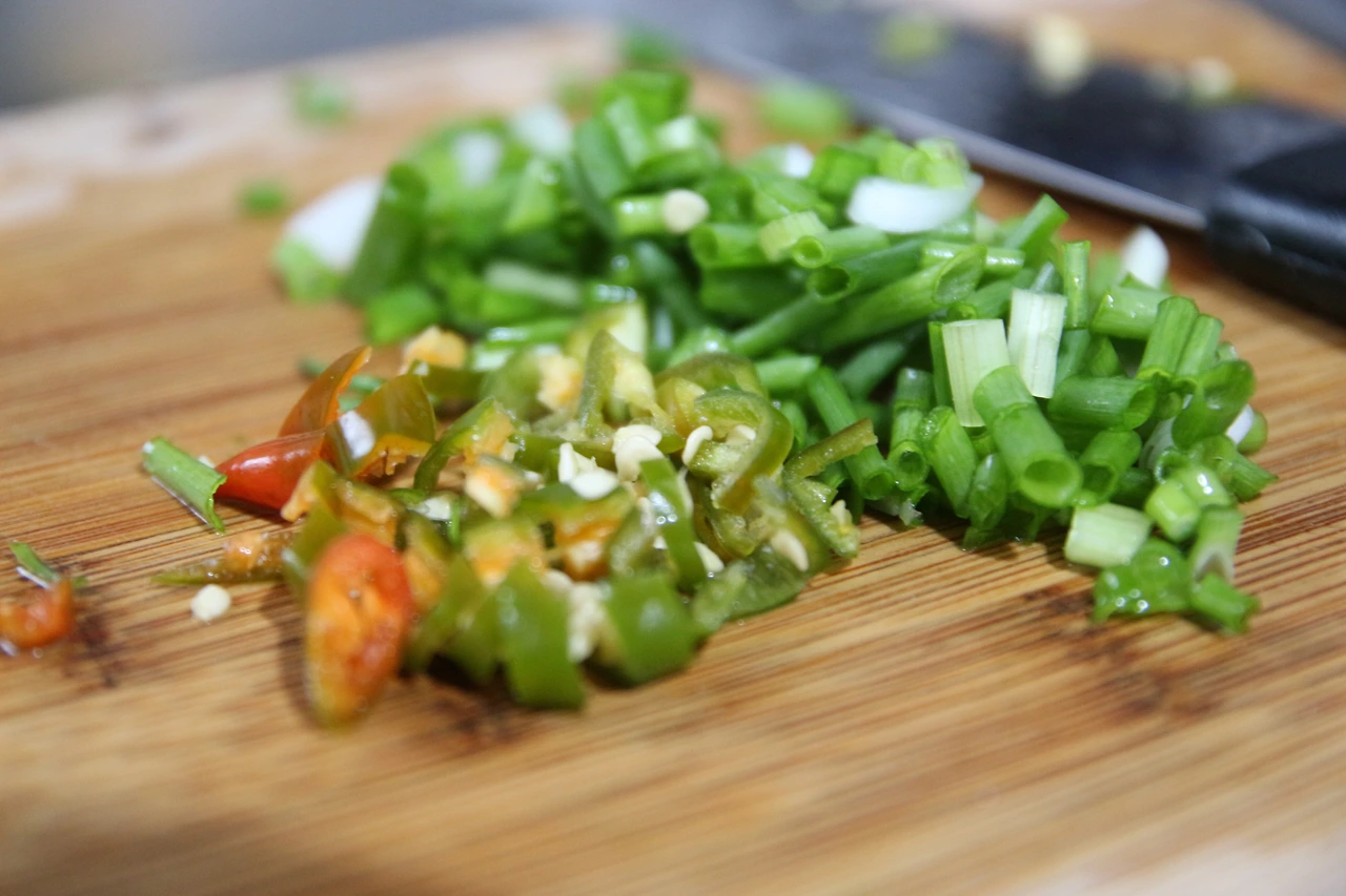 프라이팬에 기름을 과하다 싶을 만큼 넉넉히 두르고 파를 한 움큼 잡아 펼친다.