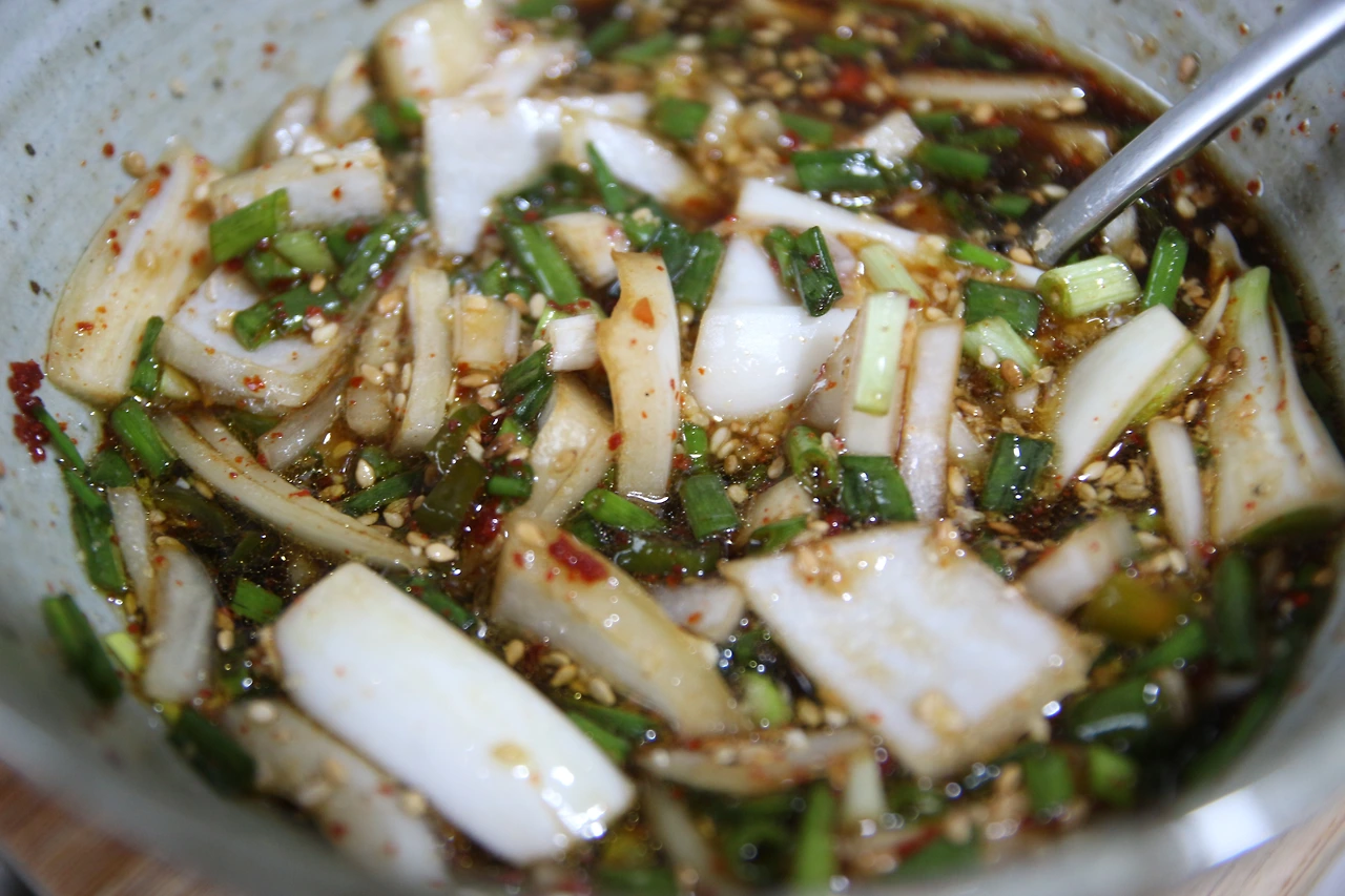 간장, 쪽파, 양파, 청양고추, 깨, 후추, 들기름을 섞어 간장 양념을 만들어 놓는다.