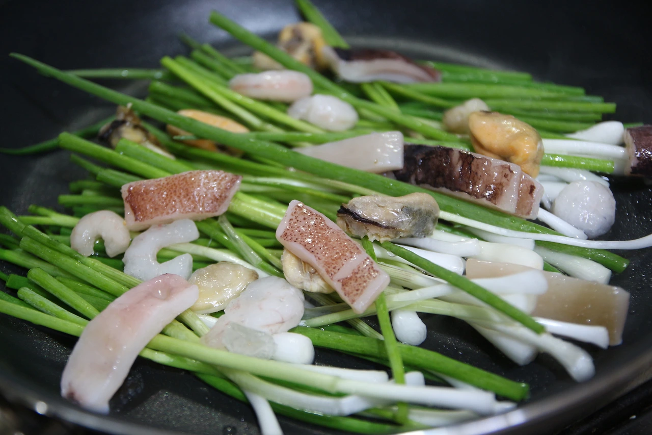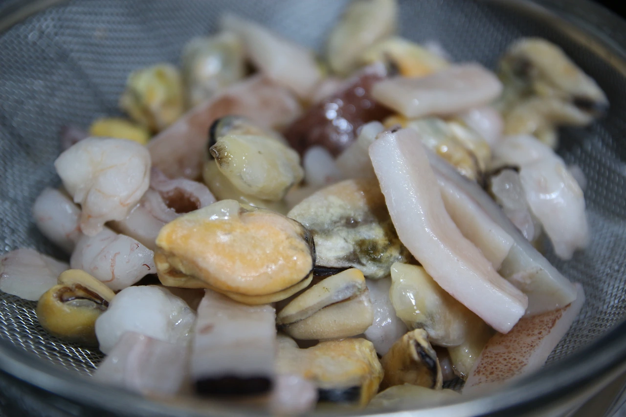 해물 모둠은 물에 한번 헹구어 체에 밭쳐 놓는다.