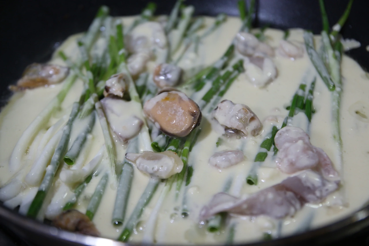 여기에 해물을 넣고 반죽을 국자로 떠서 둘러준다.